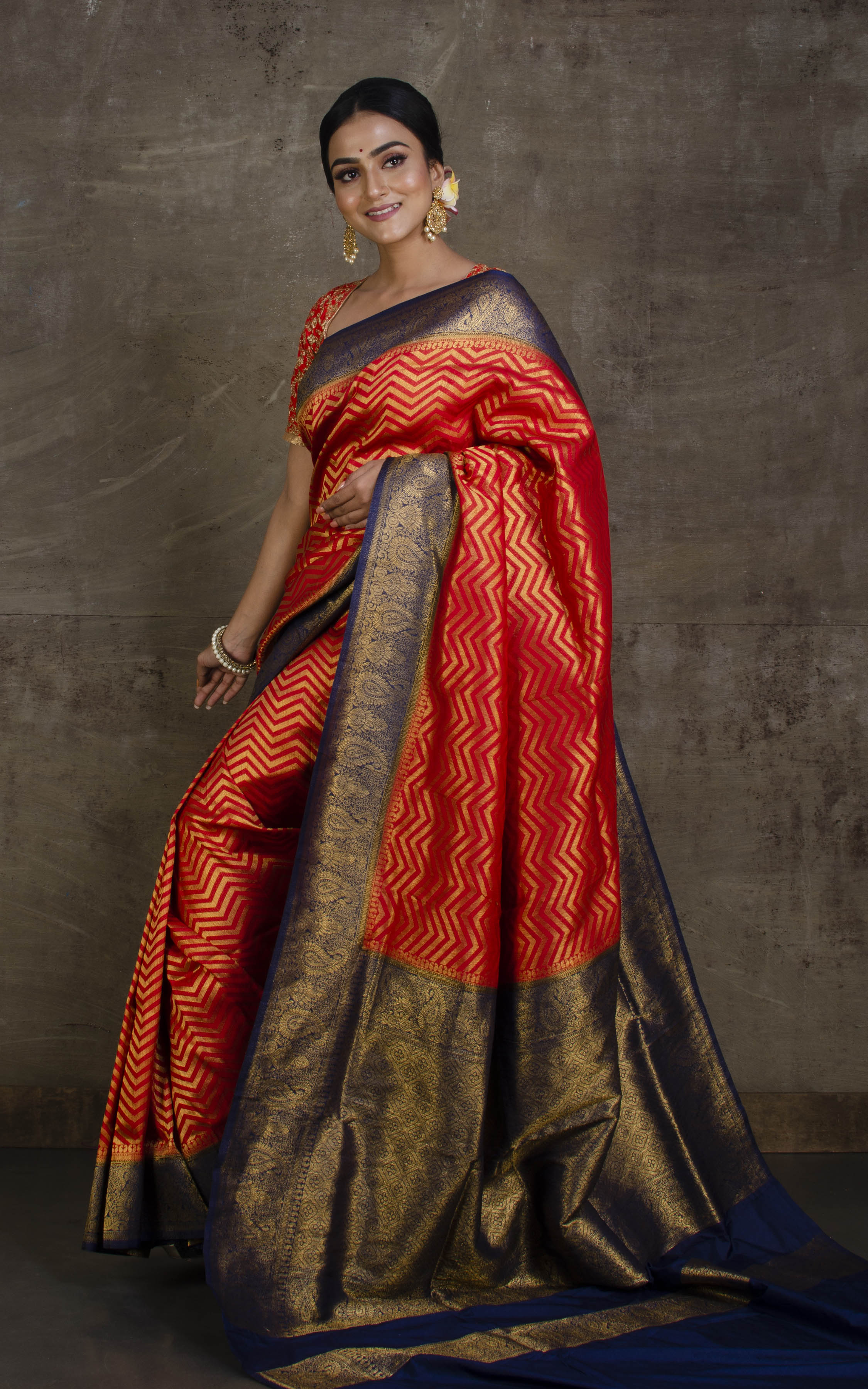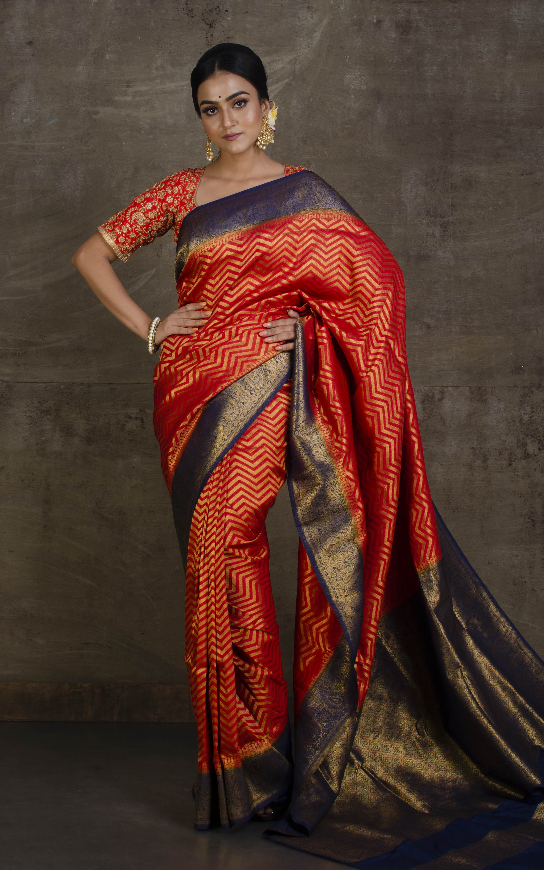 Tanchui Brocade Work Katan Silk Saree in Crimson Red and Midnight Blue