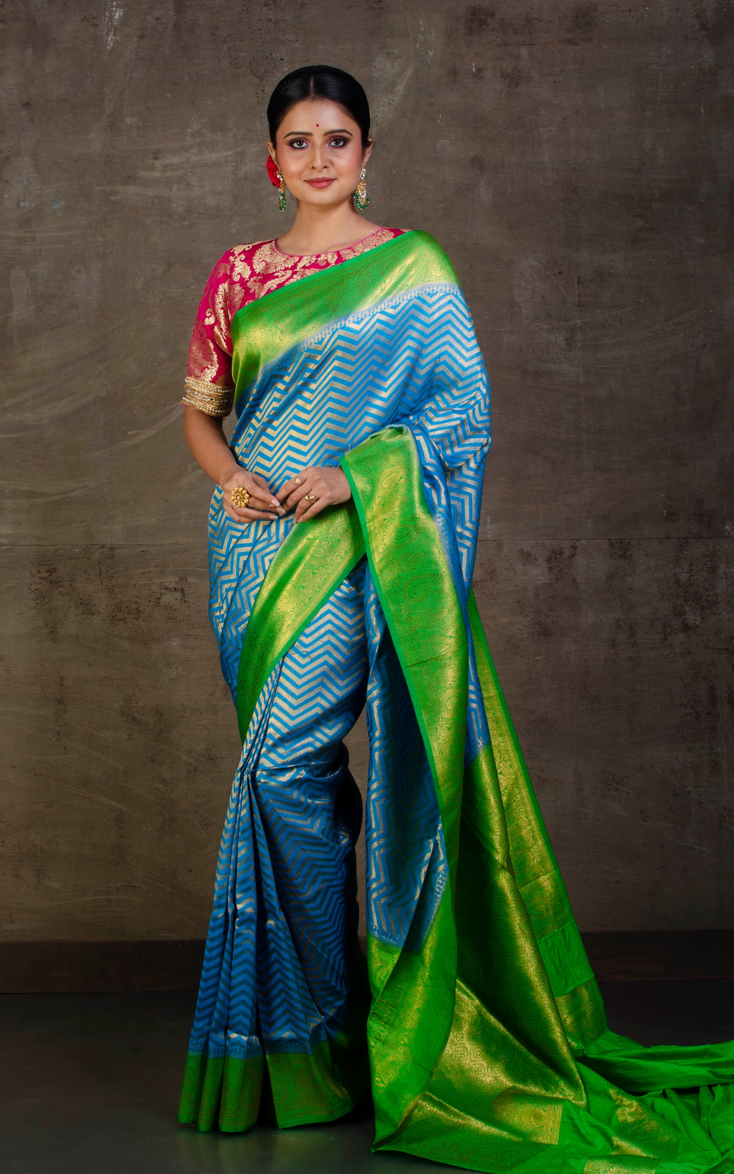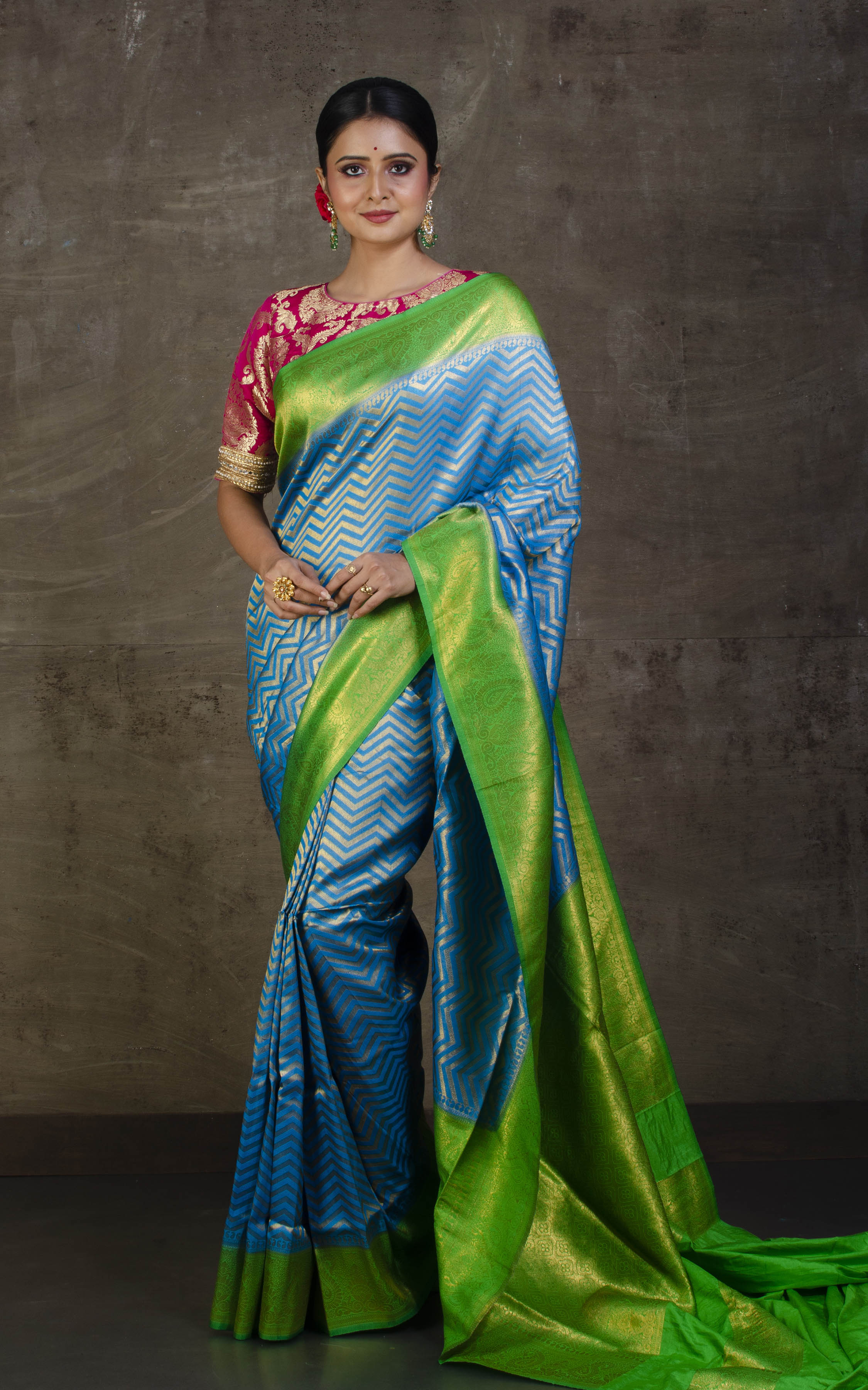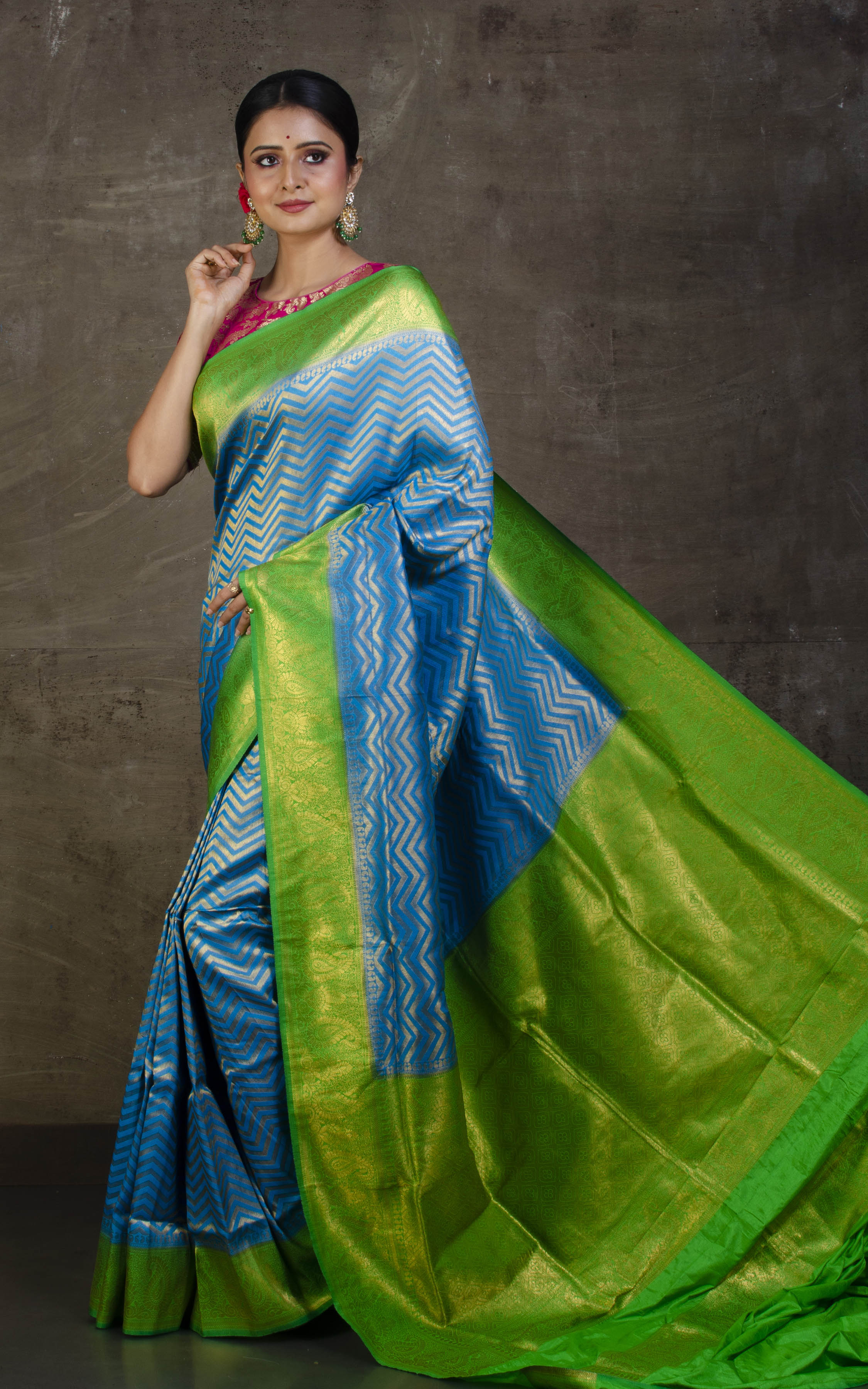 Tanchui Brocade Work Katan Silk Saree in Golden Azure Blue and Parakeet Green