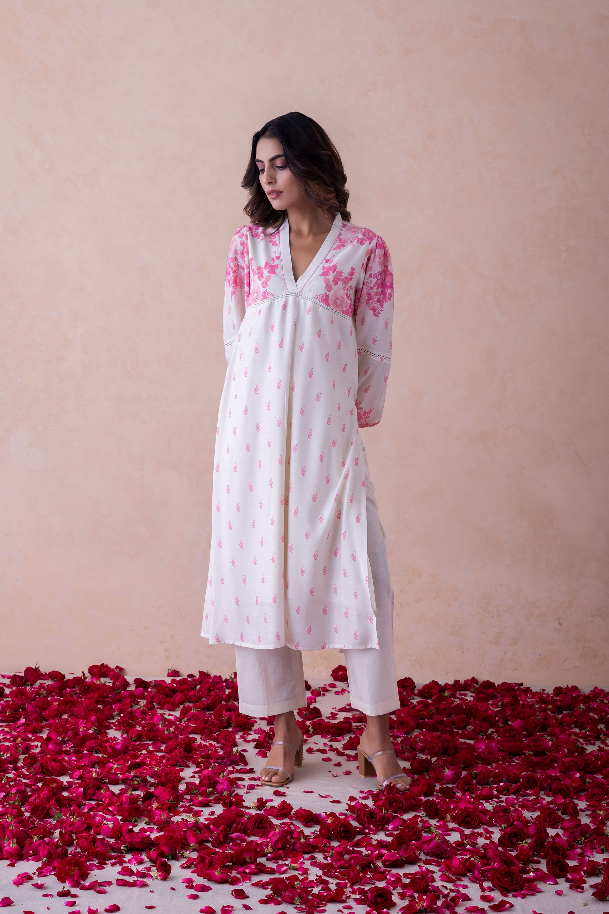 White Kurta Set with Blush Pink Hand EmbroideryThis elegant kurta set features delicate blush pink hand embroidery on the sleeves and yoke, set against a soft white base. Paired with cotton bottoms and cambric lining for a blend of comfort and sophistication.Product Type: Two-Piece SetPattern: Hand EmbroideryLength: Kurta – Knee-Length | Pants – Full-LengthClosure: Slip-OnLining: Fully Lined with Cambric