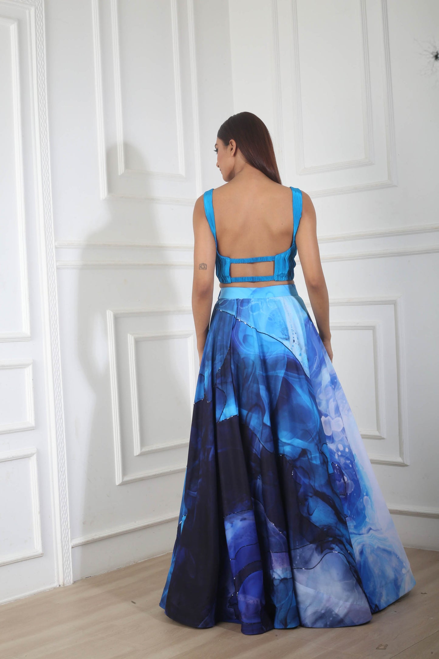 Teal blue ruched crop top with blue printed embellished skirt set.