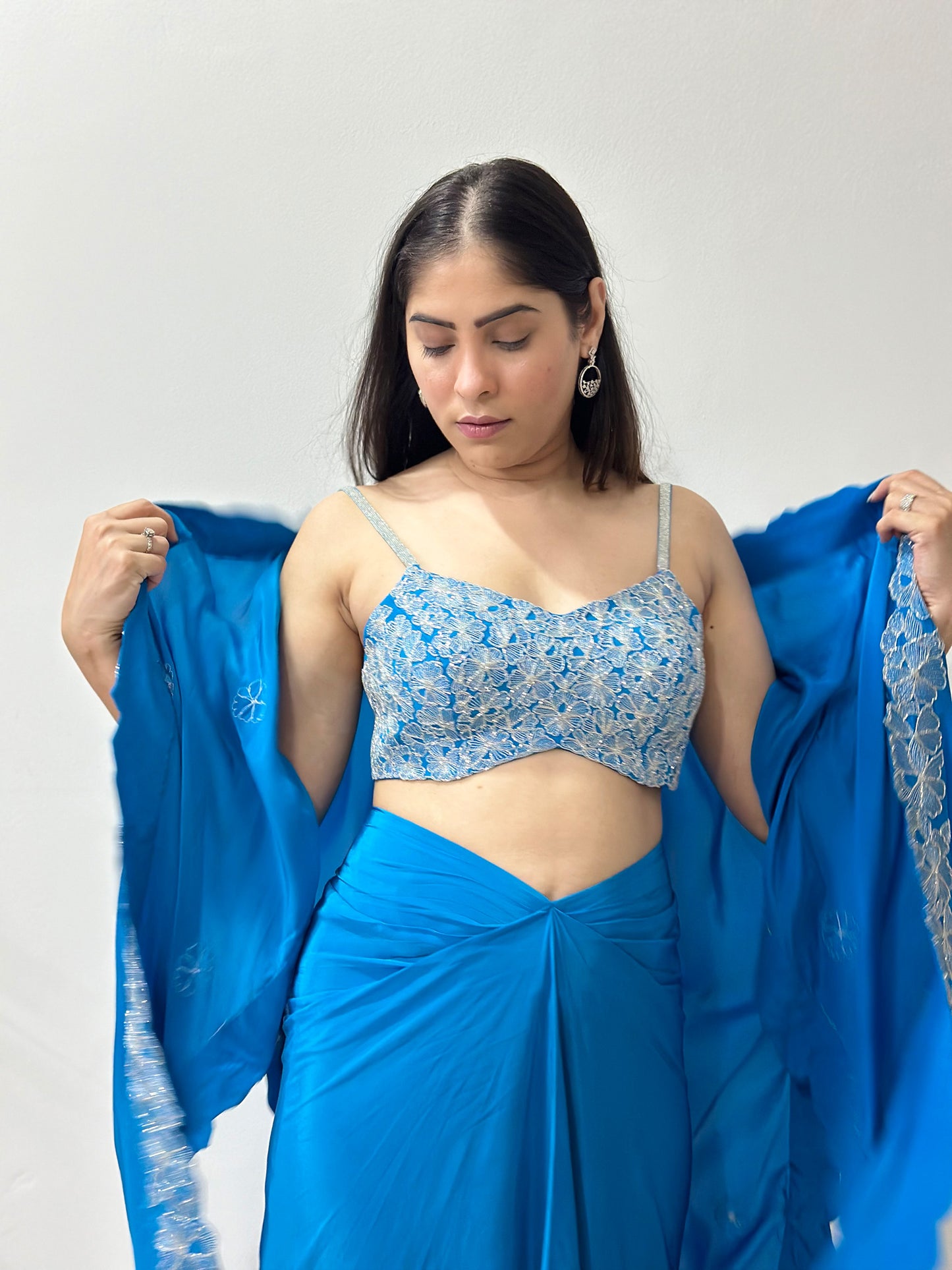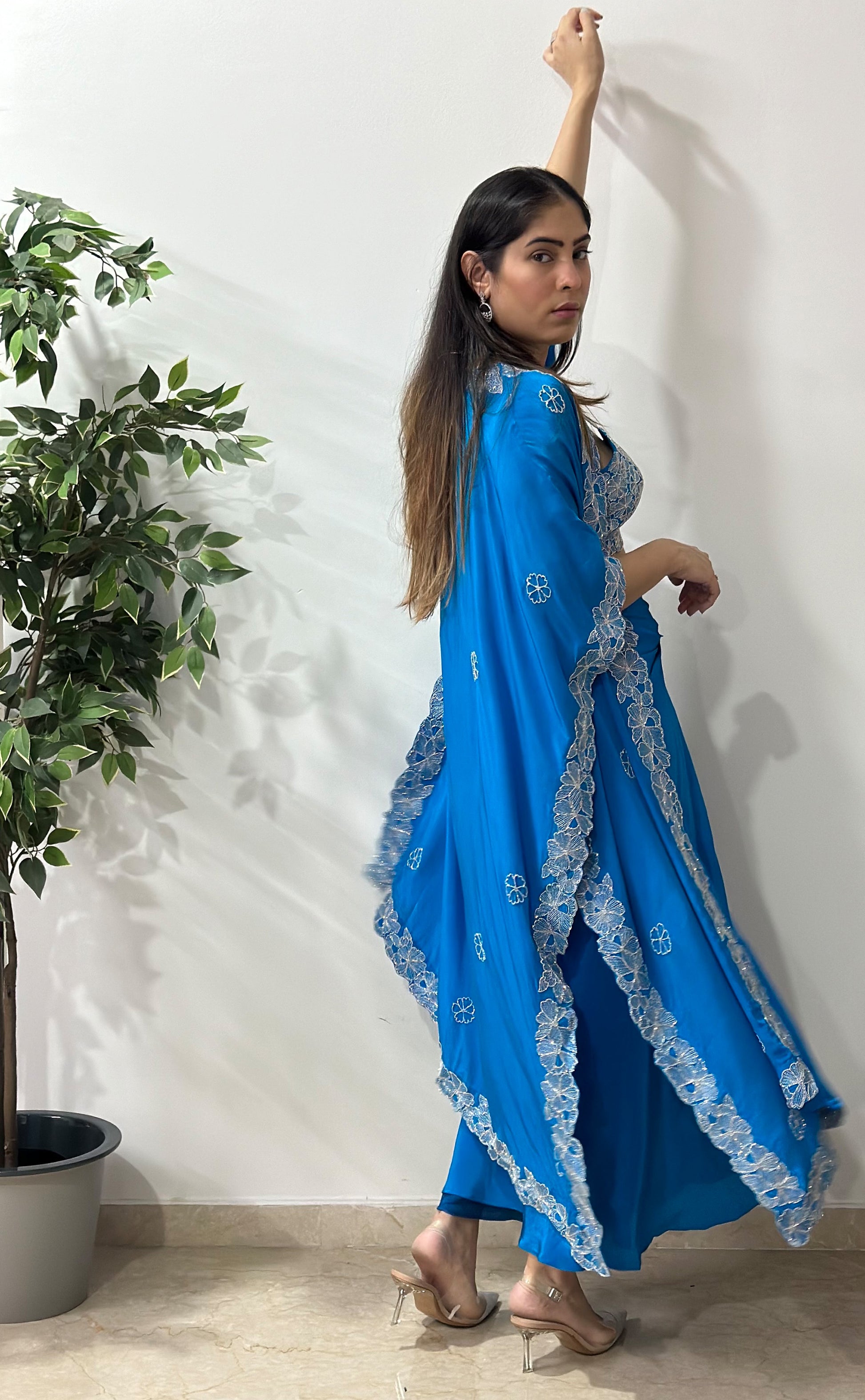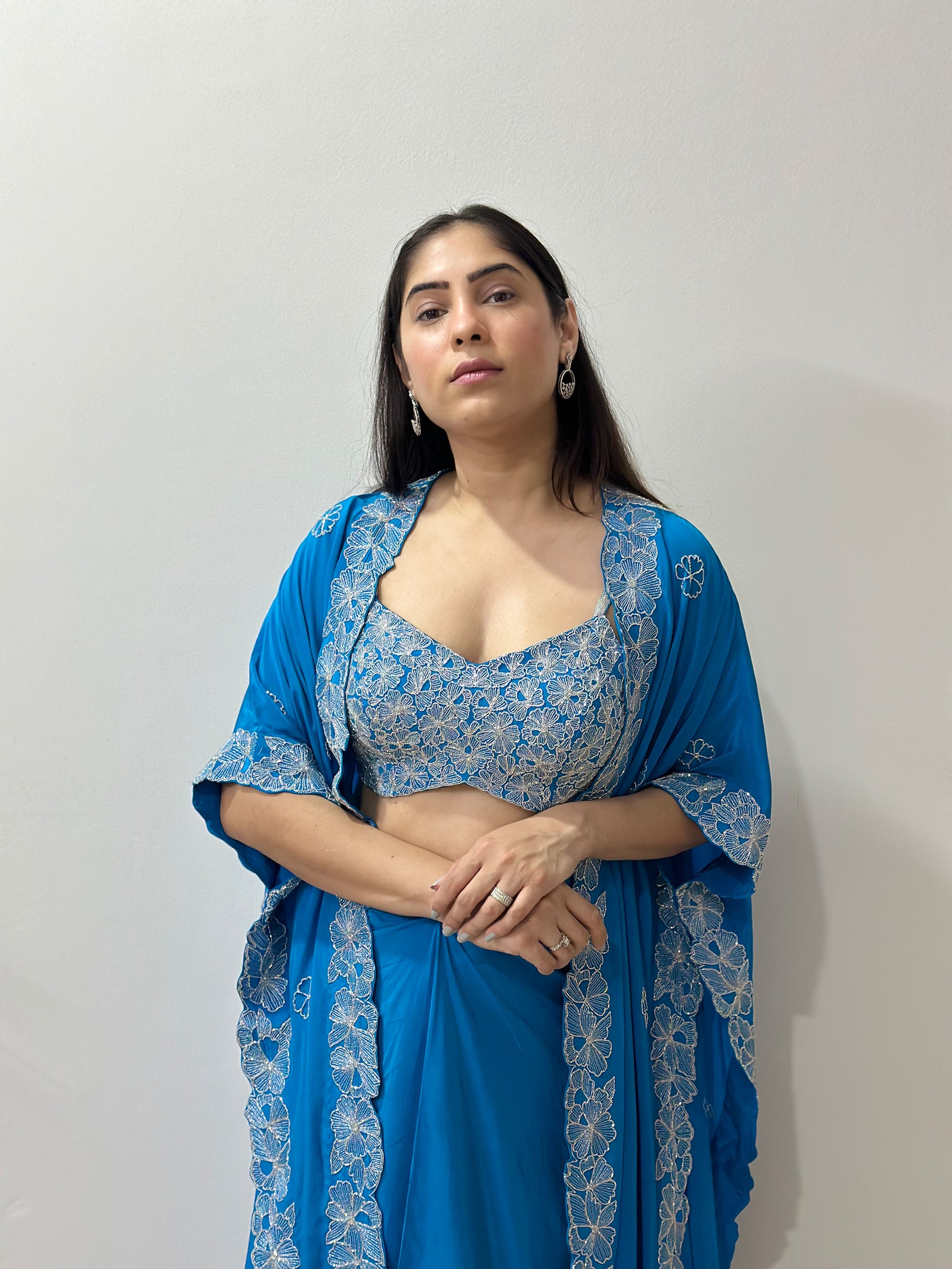 Teal blue embroidered blouse with matching tulip draped skirt and embroidered cape with flower motifs all over.