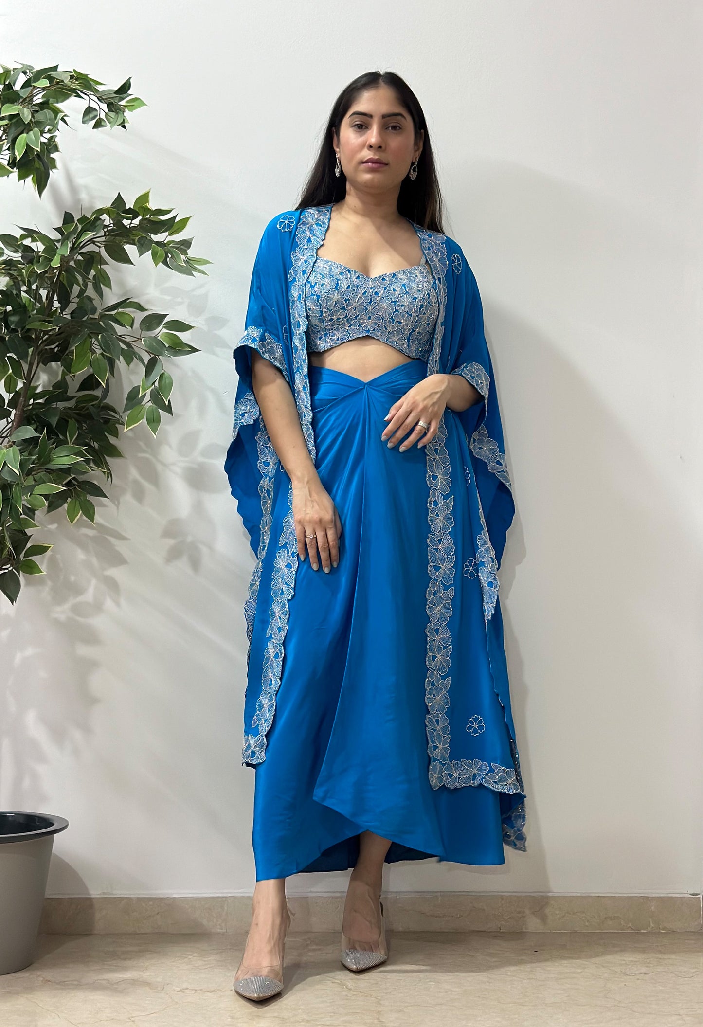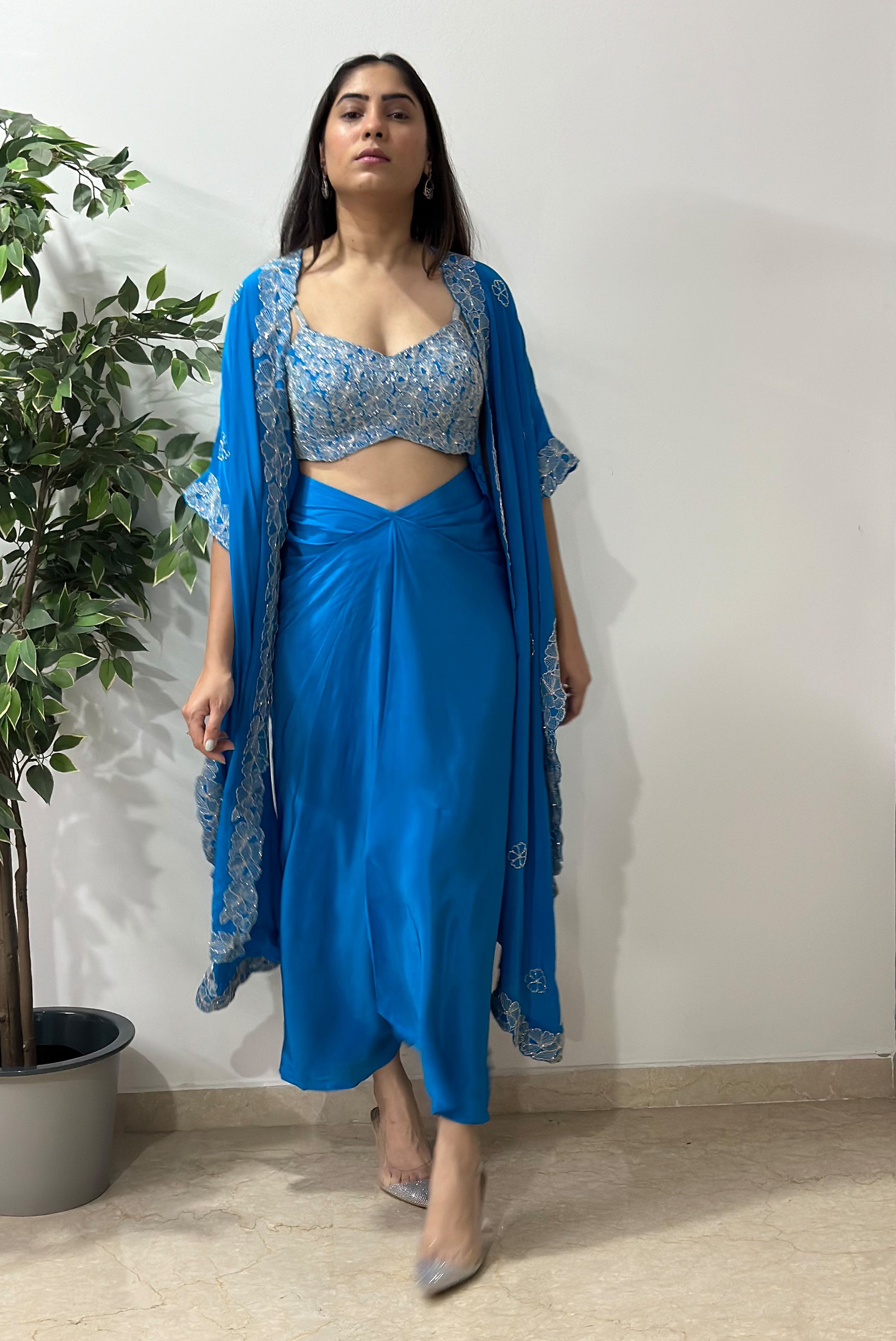 Teal Blue Tulip Skirt with Cape Shades of Blue Designer Wear