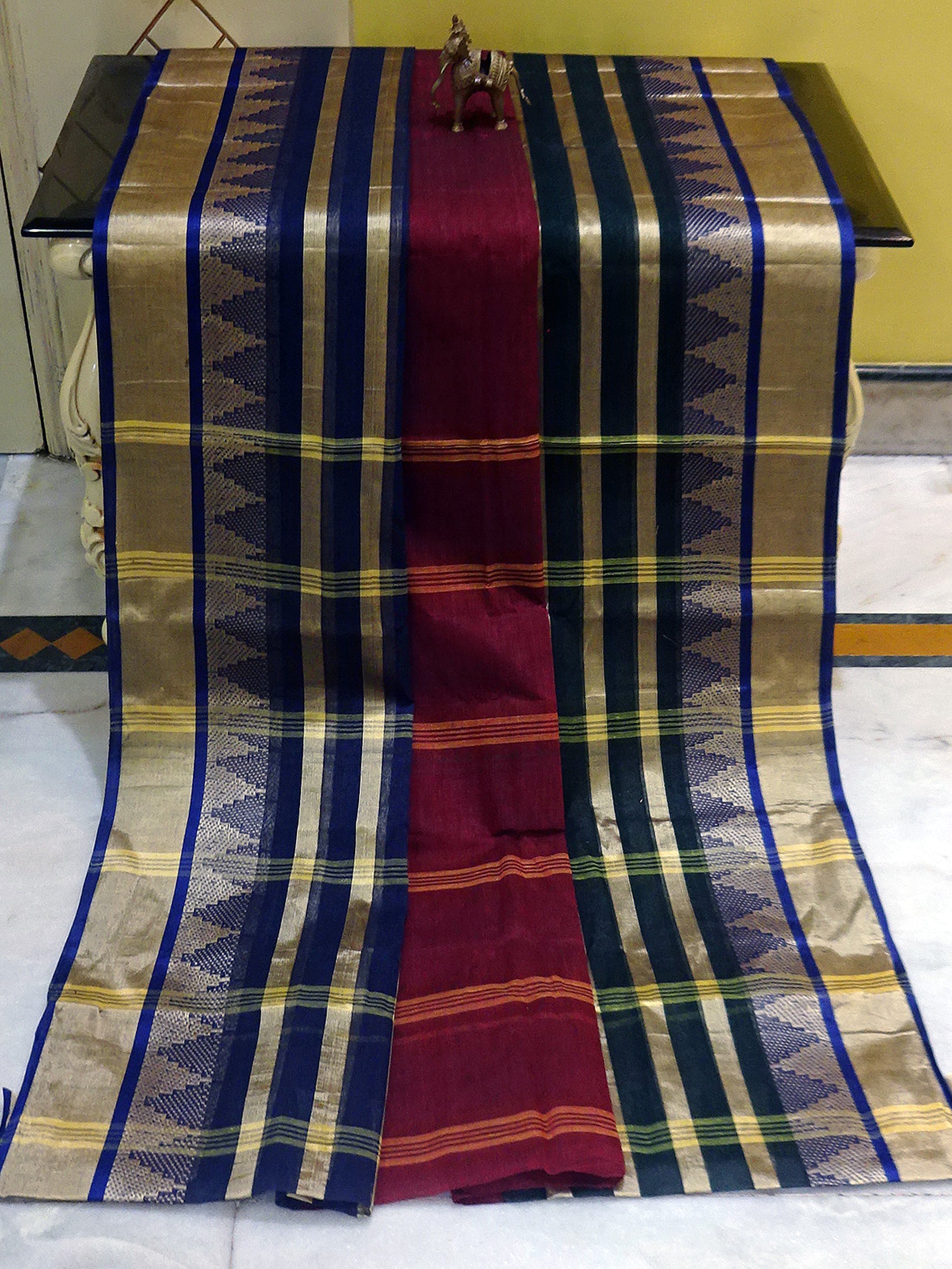 Temple Border Tangail Cotton Saree in Maroon, Navy Blue and Green with Beige Stripes