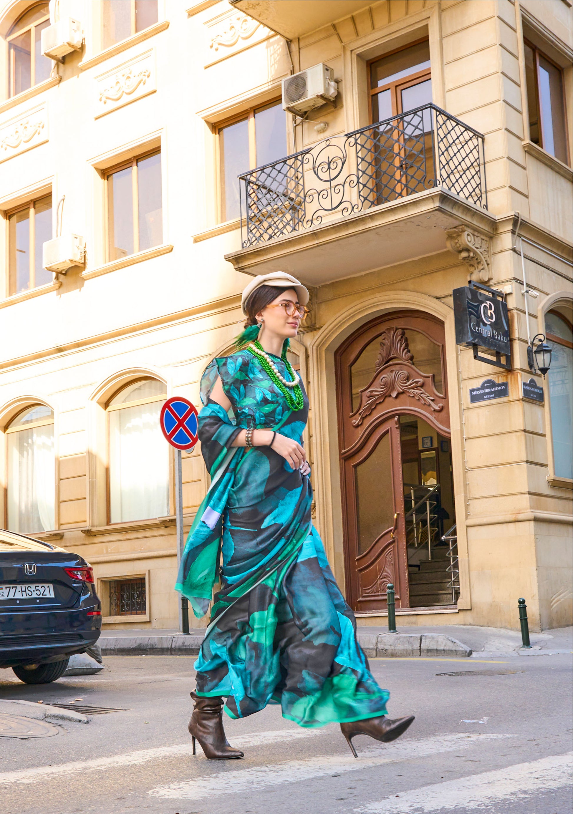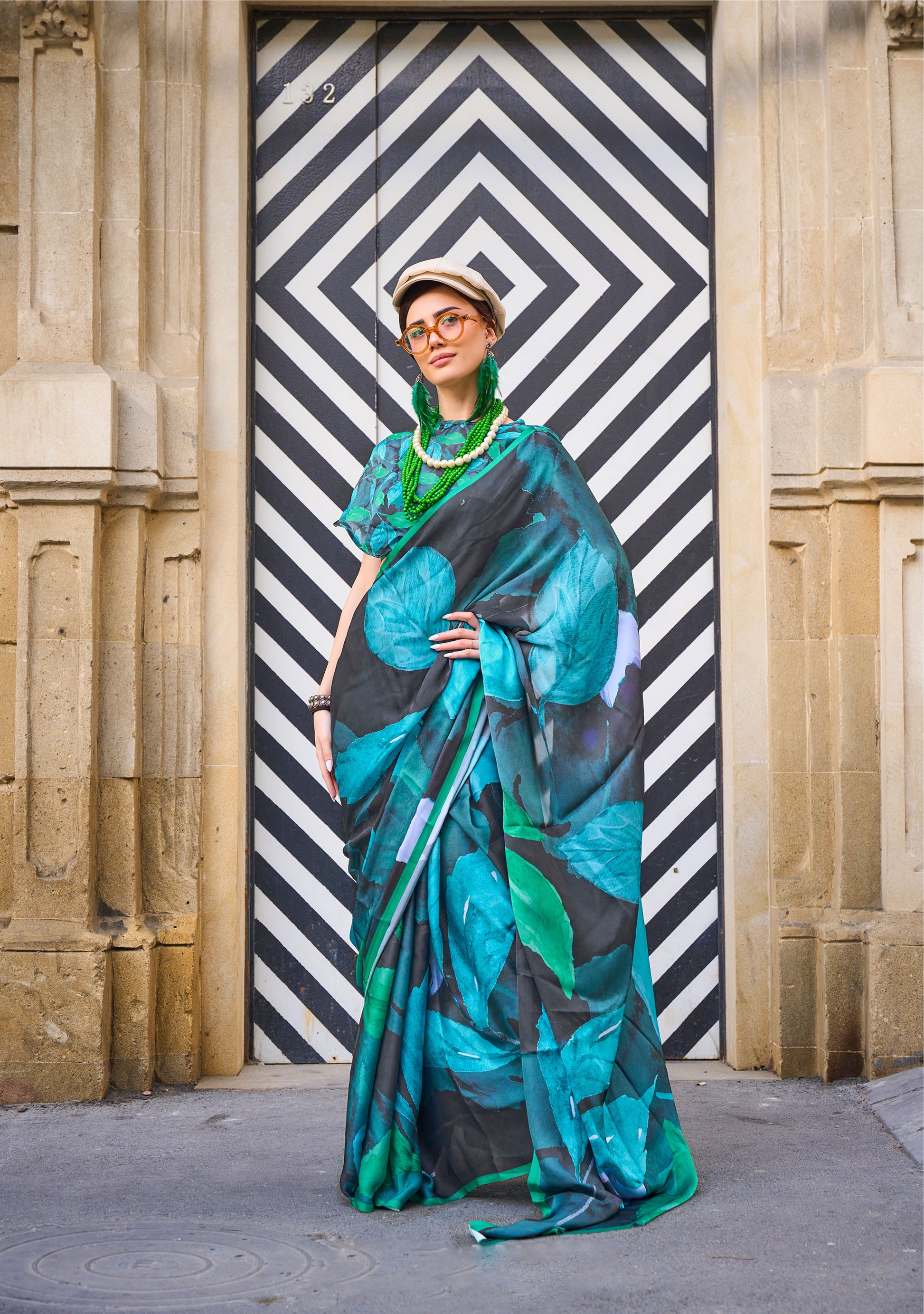 Turquoise Green Floral Kolombus Satin Georgette Printed Saree