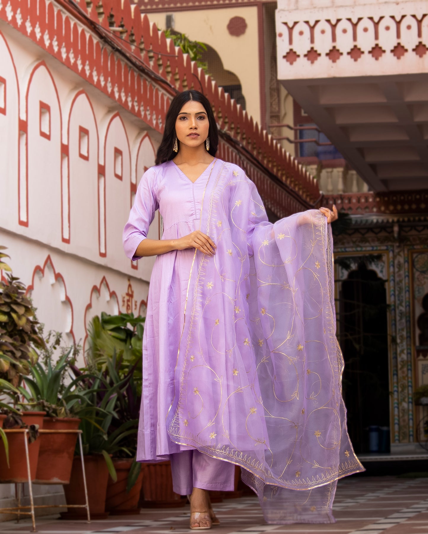 This three piece set comes with a twirl ready flared kurta, similar toned moderately flared pant, and a beautiful similar coloured dupatta with aari embroidery all over it. The dupatta of this monochrome suit set has aari embroidery jaal work.