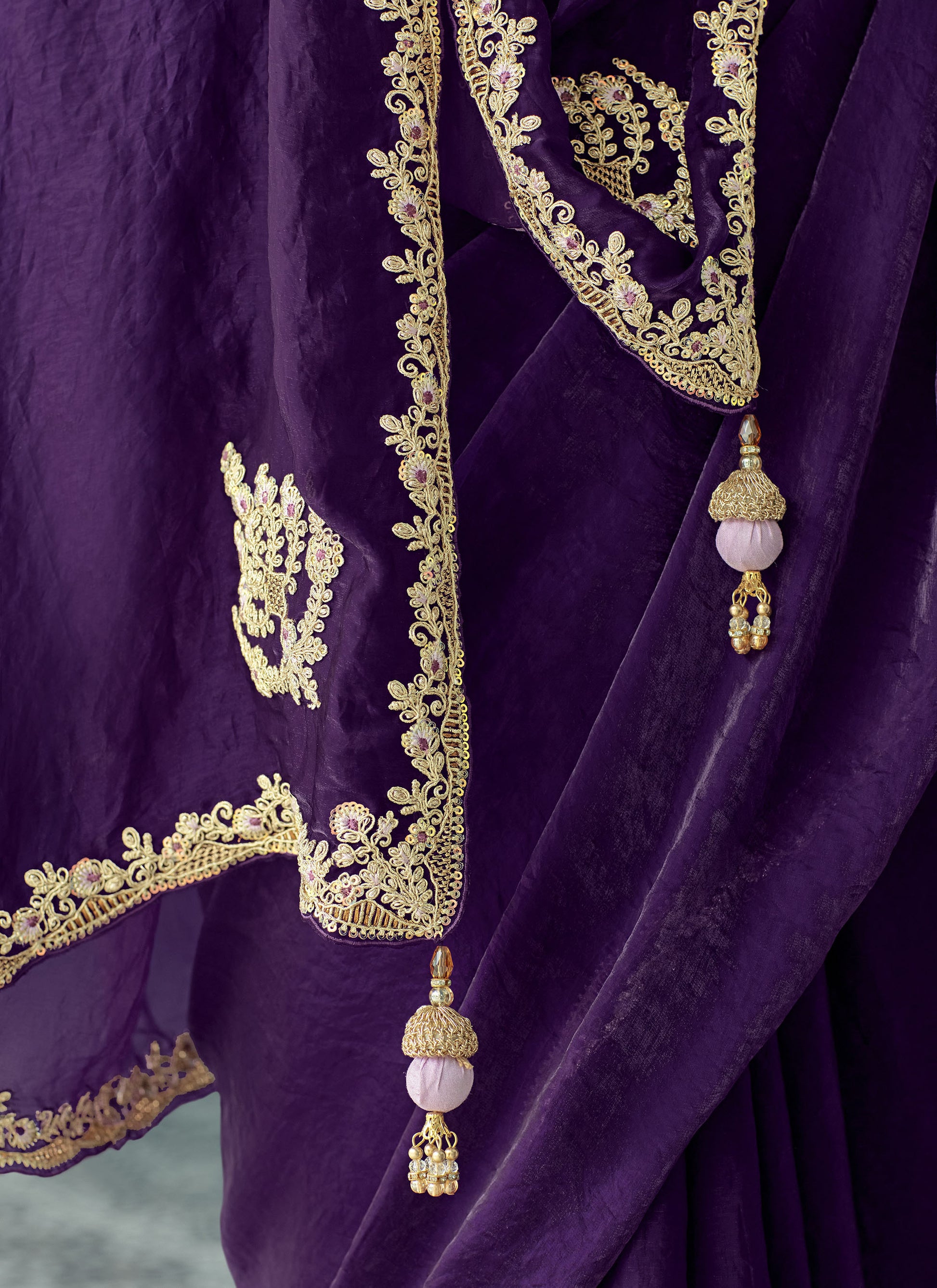 Violet Glass tissue Organza & Crush Moti Embroidered Festive Amber Saree