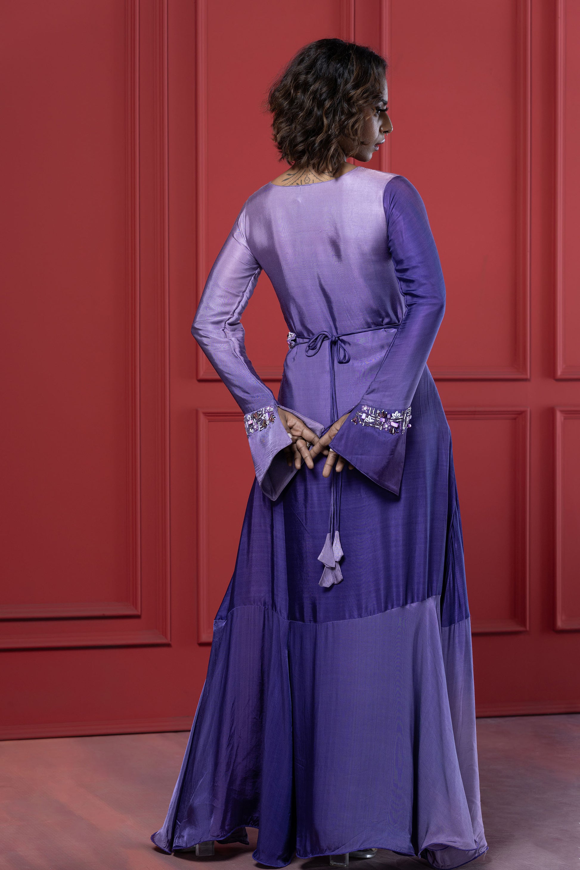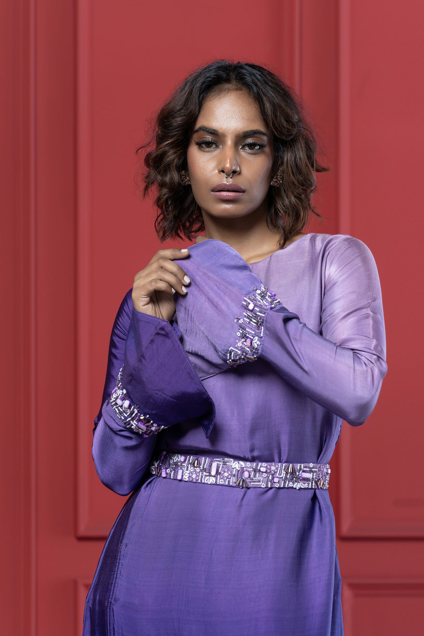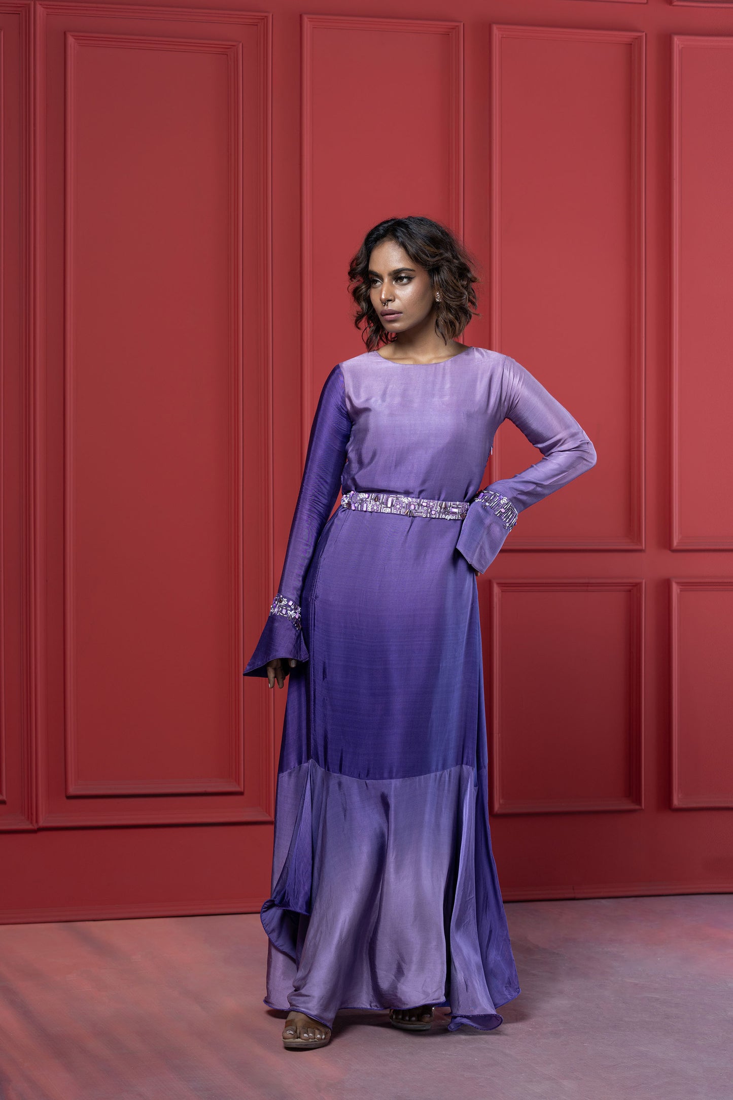 This ombre tunic has a gradient effect with long bell sleeves looks very feminine, embellished with poth, crystal and sequence work on wrist and detachable belt area.