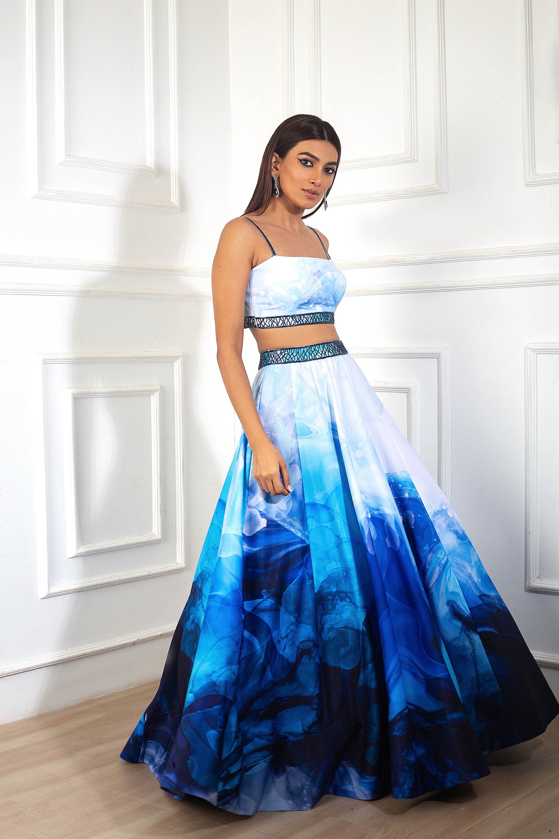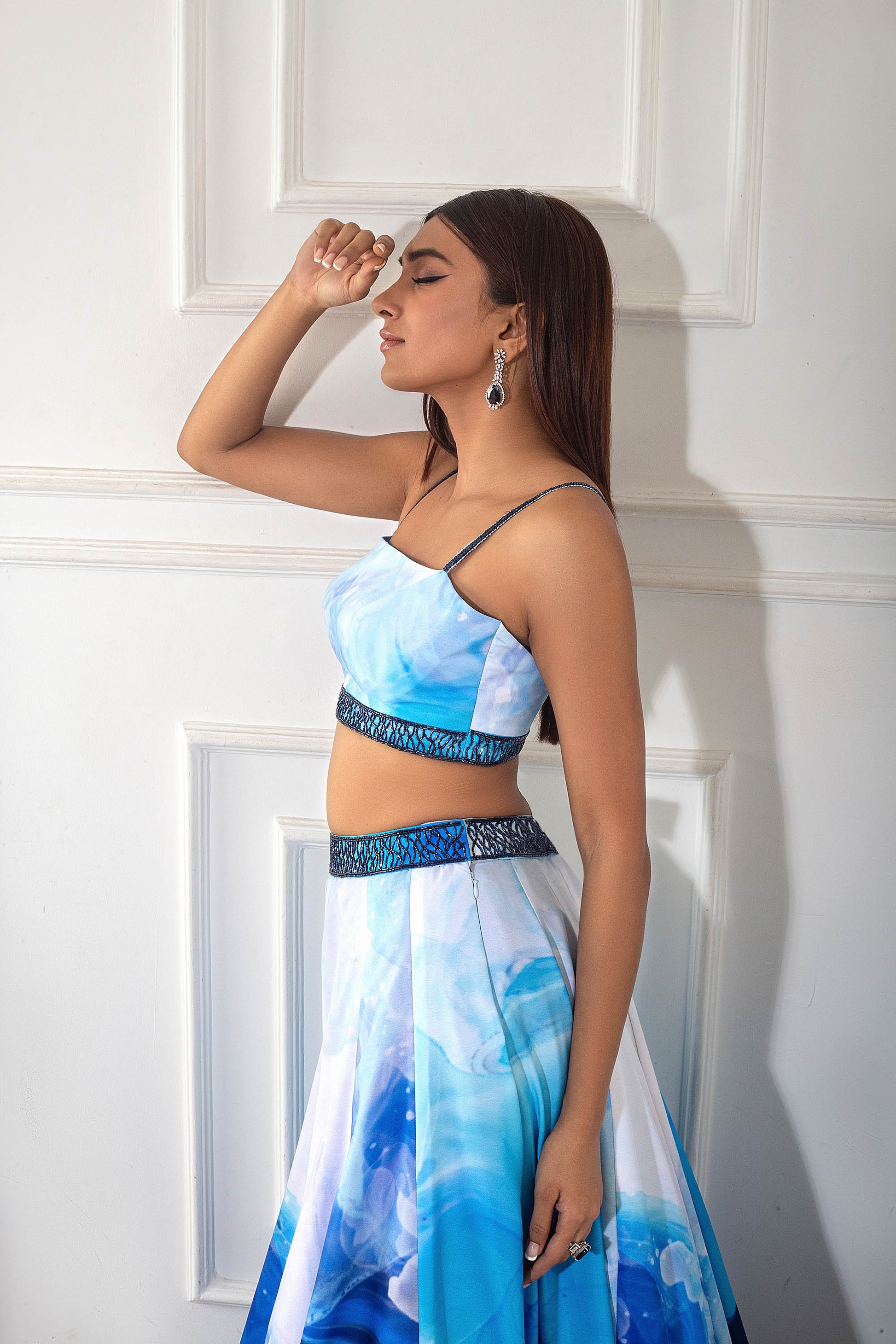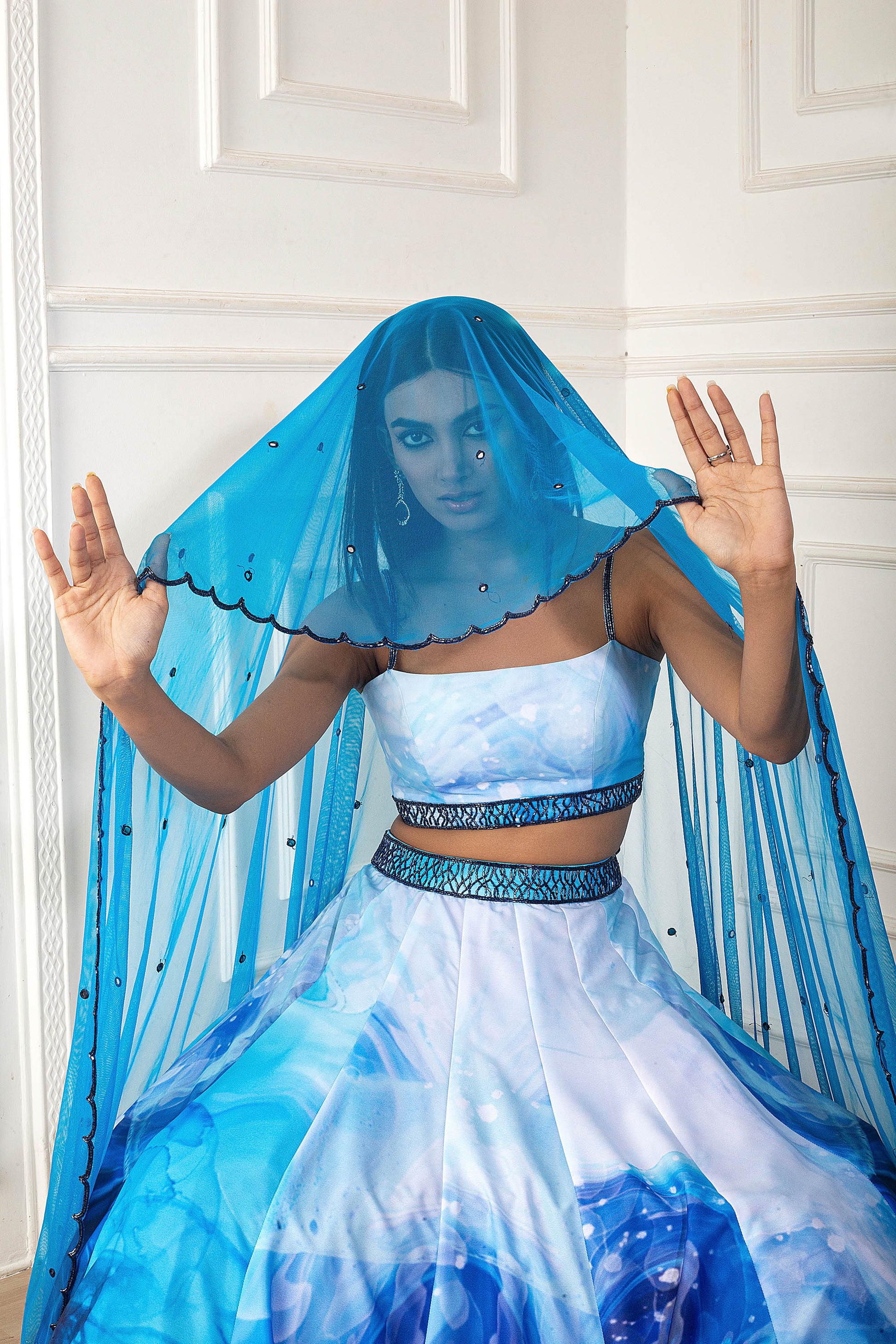 White printed embellished strappy blouse with matching printed embellished lehenga and teal blue heavy embroidered dupatta.