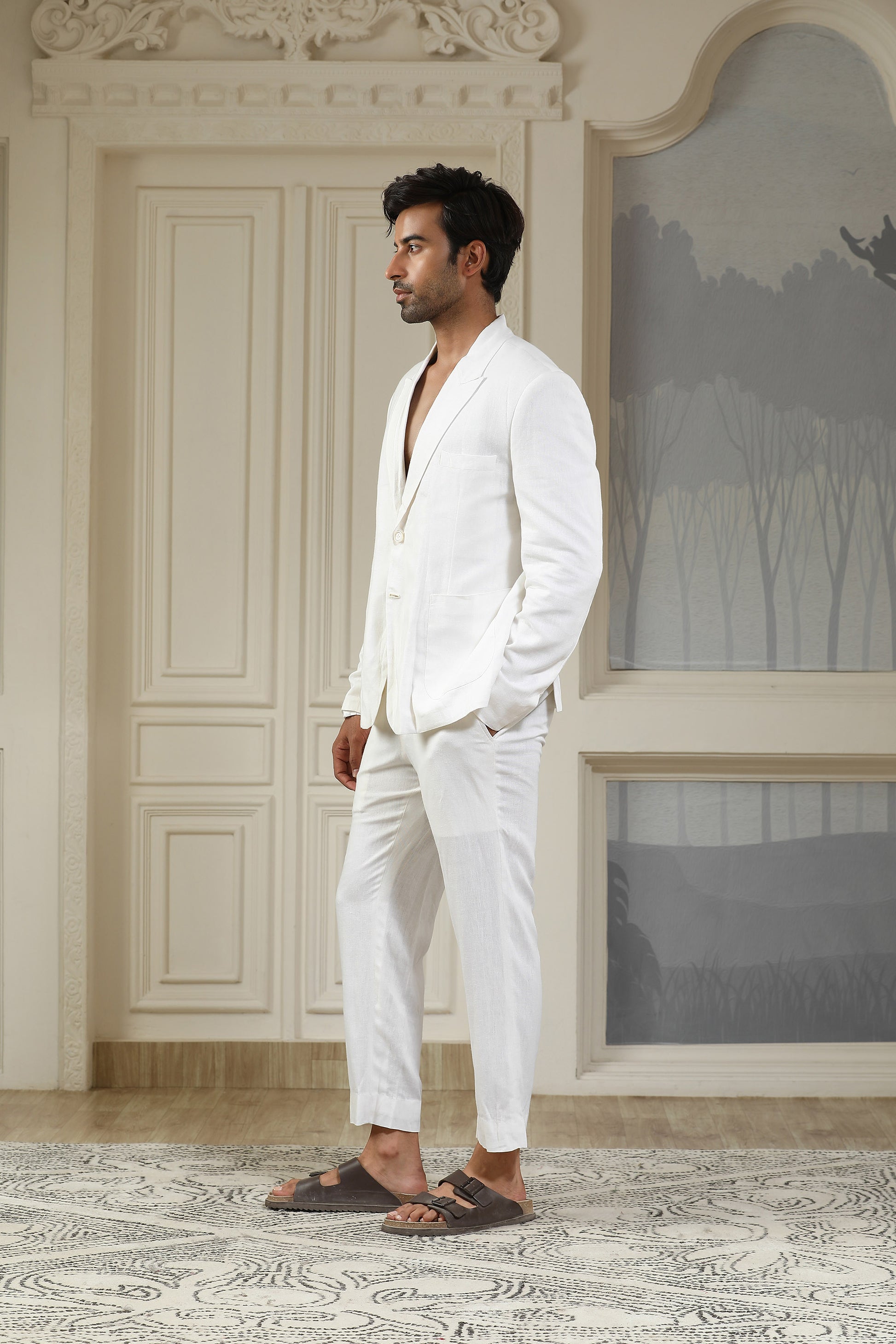 Timeless and effortlessly refined, this all-white suit set is crafted in breathable pure linen. The jacket features a clean, minimal silhouette with no embellishments, allowing the fabric’s natural texture to take center stage. Paired with matching white linen pants, this ensemble is perfect for summer soirées, destination weddings, or daytime formal events with a relaxed elegance.