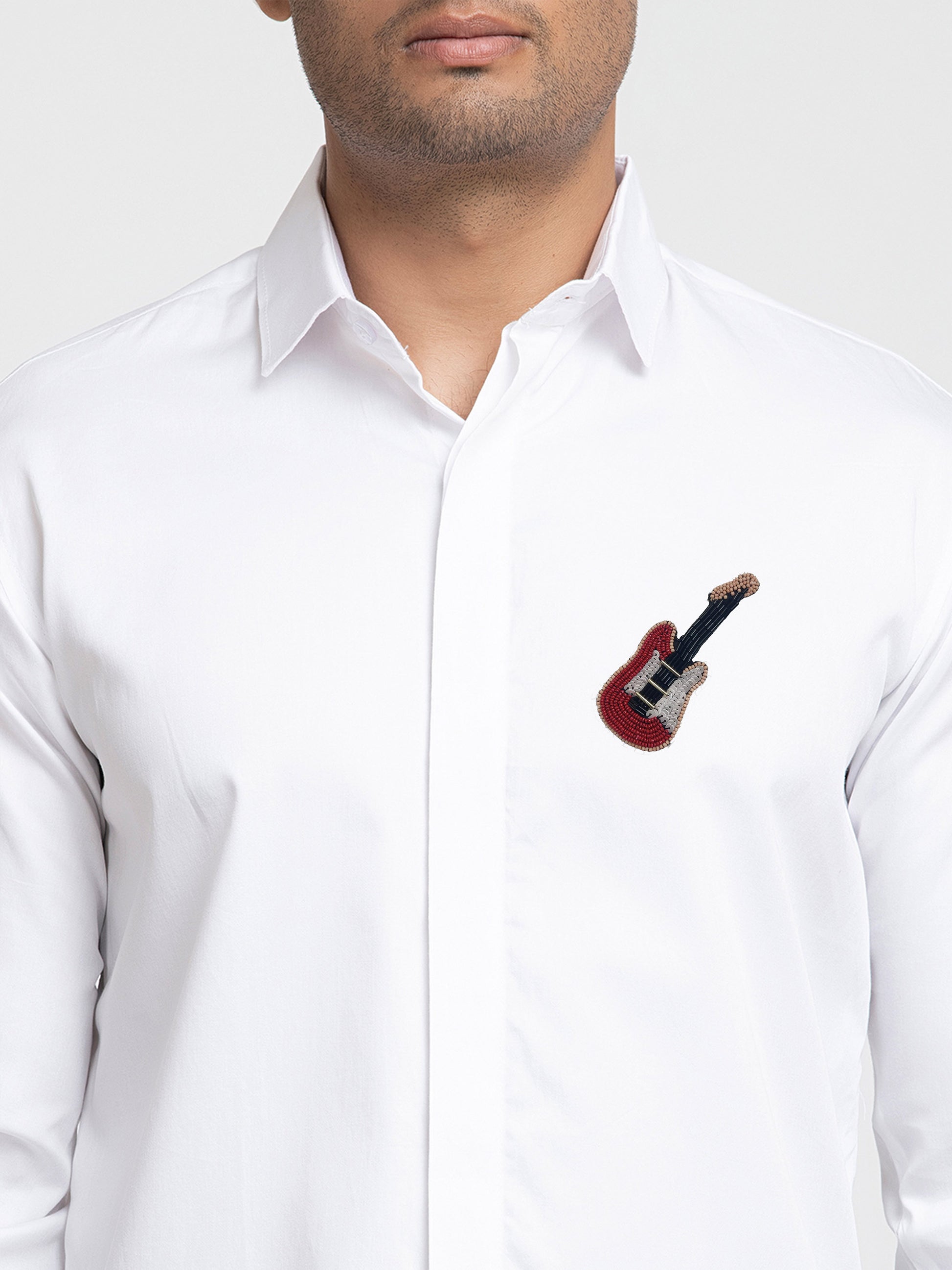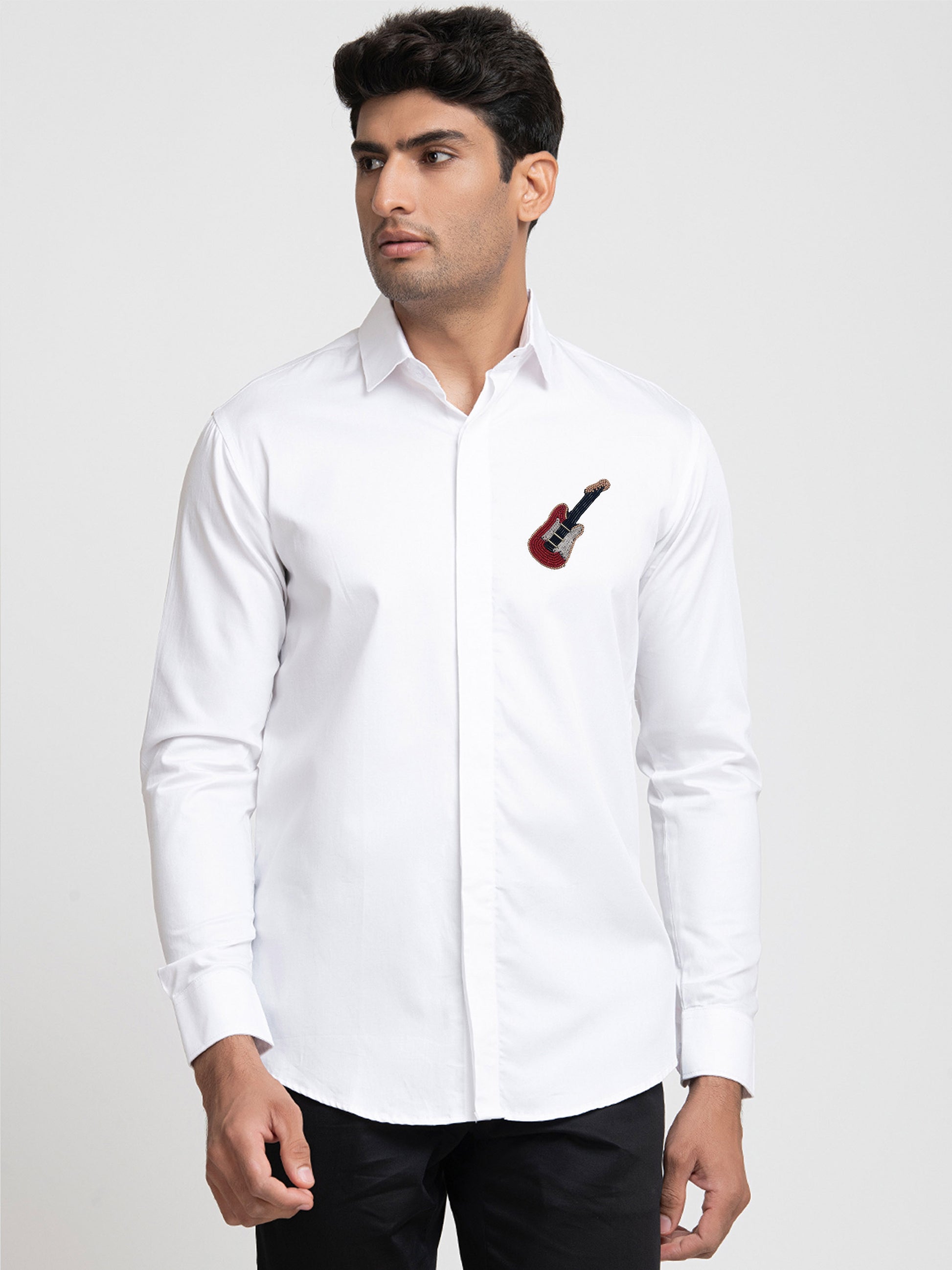 The intricate guitar embroidery, meticulously crafted with dazzling cutdana, beads, and sequins. The hidden buttons provide a seamless look, while the harmonious design captures the essence of melody. Whether you're a music enthusiast or a fashion aficionado, the Melodorn shirt strikes the perfect chord between elegance and creativity.