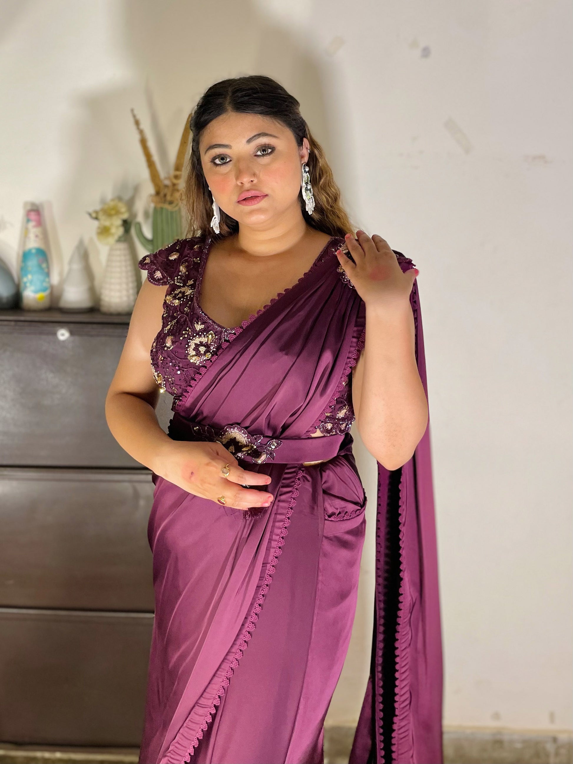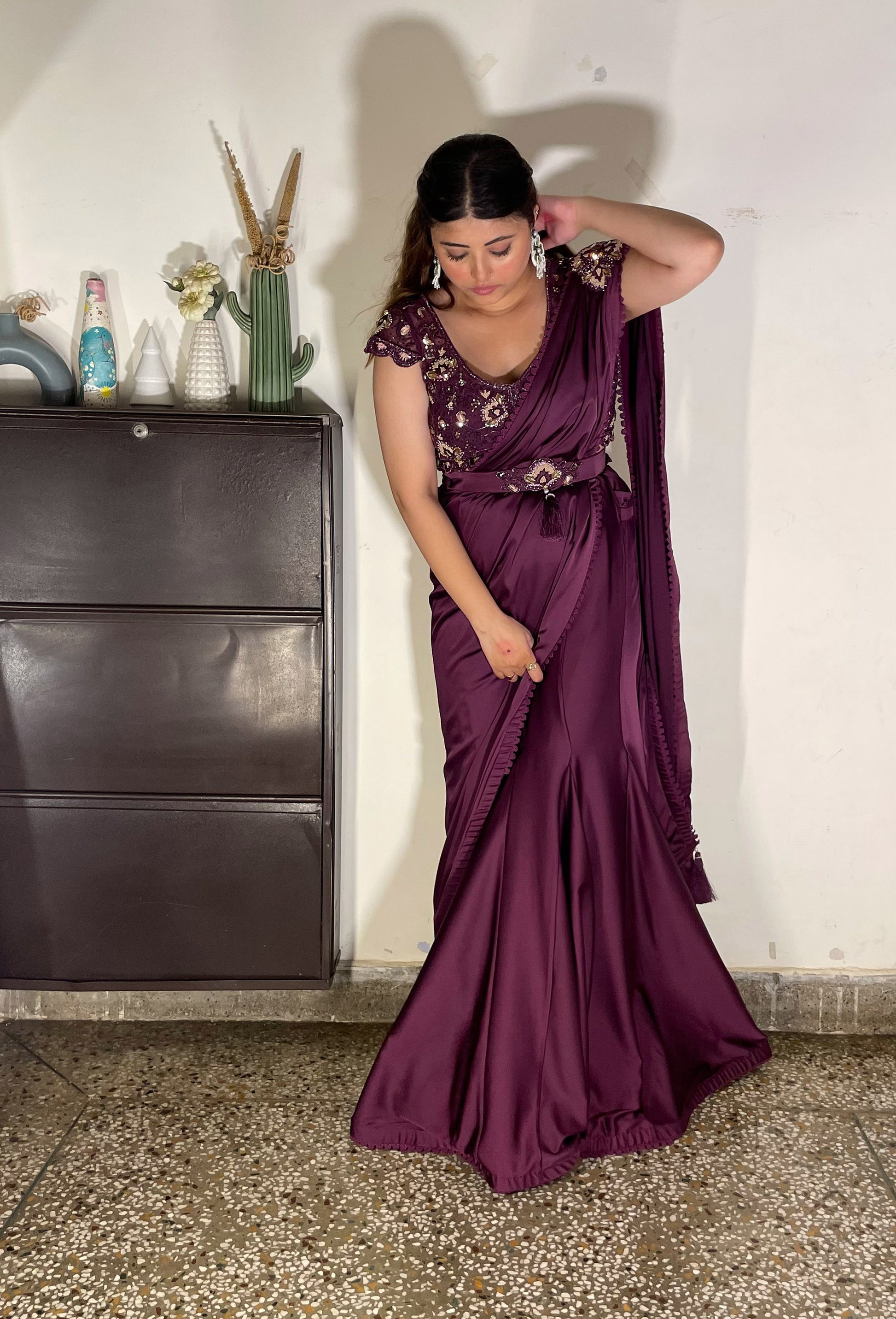 Wine French Satin hand embroidered Cocktail Lehenga saree