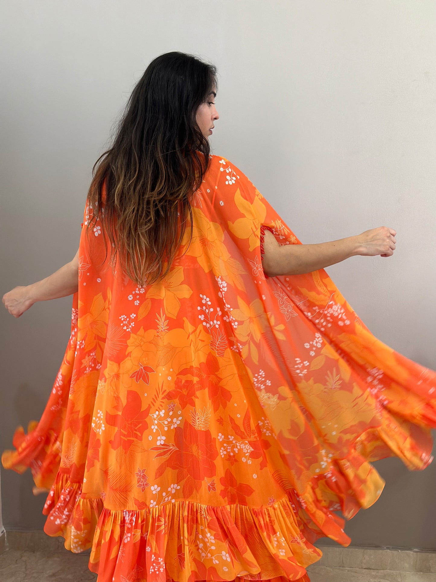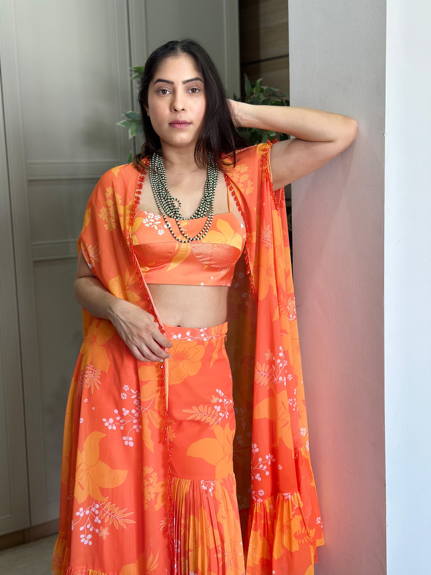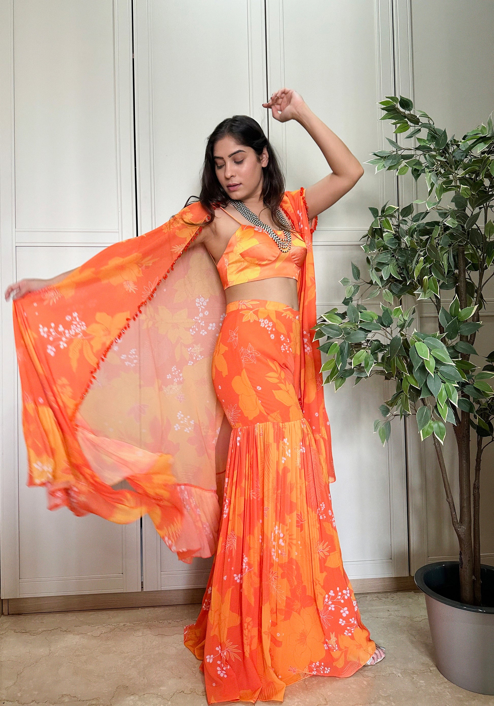 Yellow/orange printed bustier with matching sharara and cape with ruffles and crystal drops.