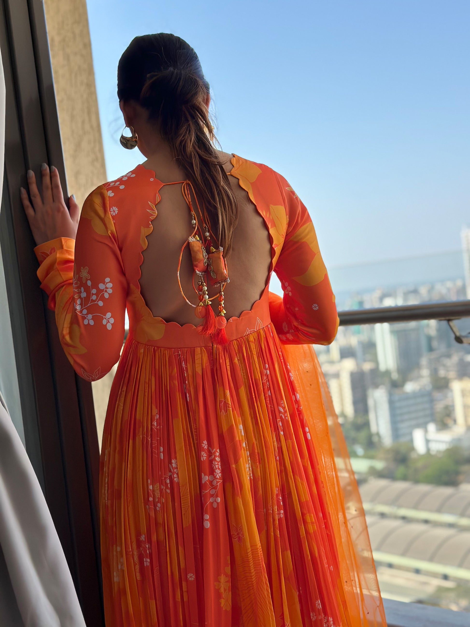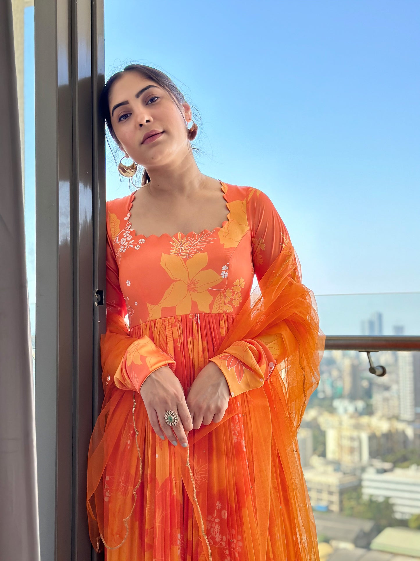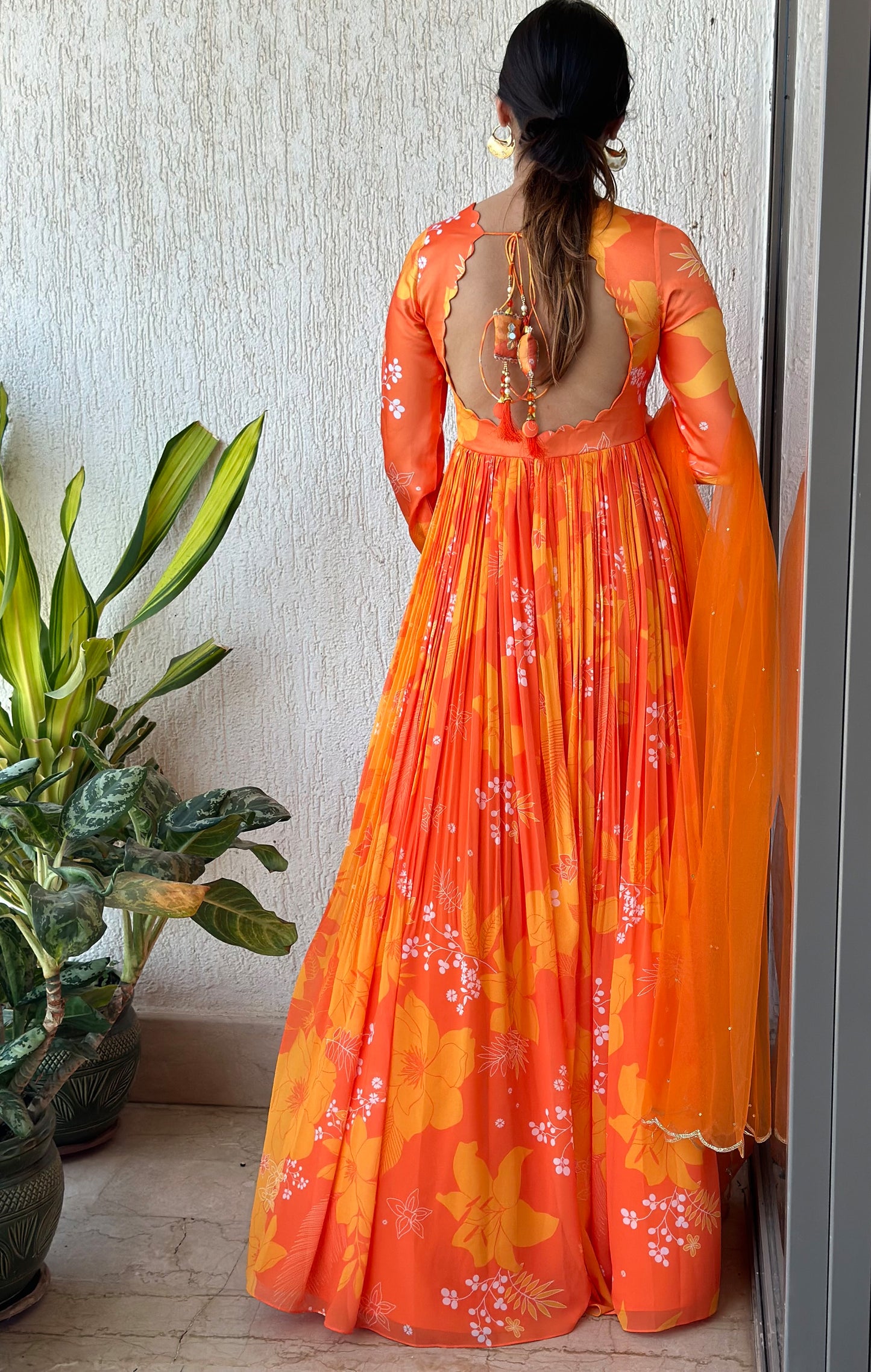 Yellow and Orange Printed Self Scallop Designer Anarkali Set