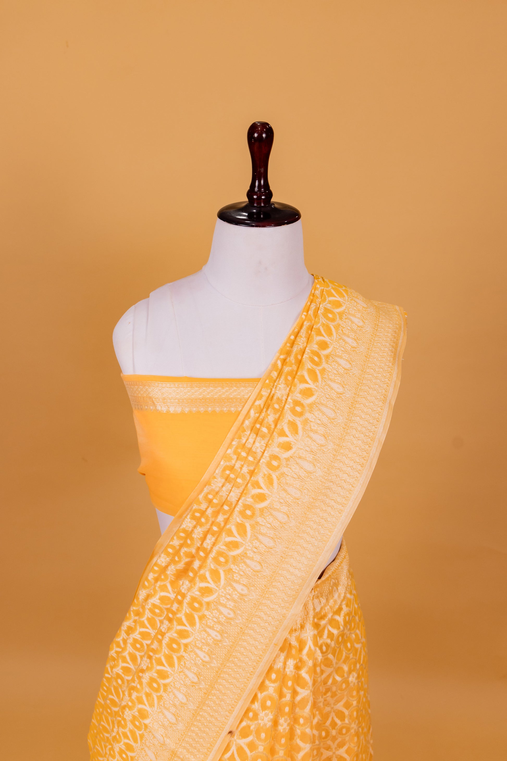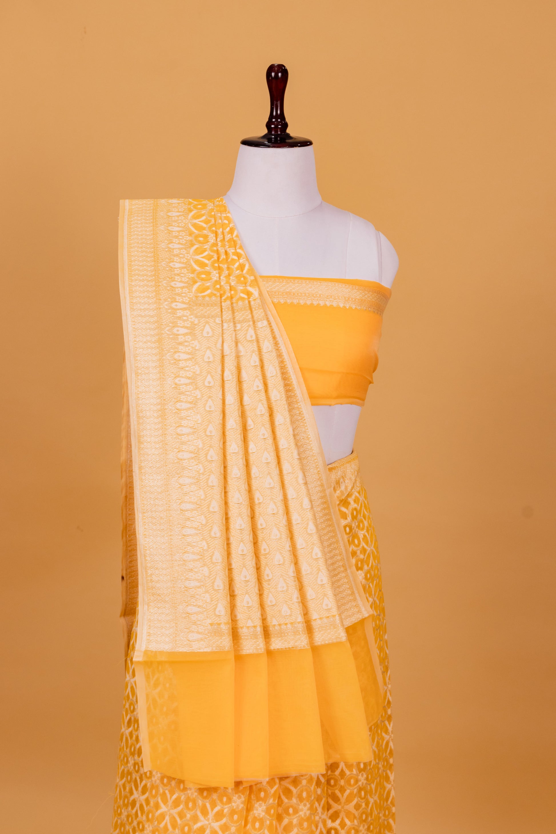Description: This Yellow Banarasi Cotton Cutwork Saree is a perfect combination of traditional and trendy. Made from high-quality cotton, it features a beautiful booti pattern and a classic border. Elevate your style with this unique saree that offers both comfort and elegance.