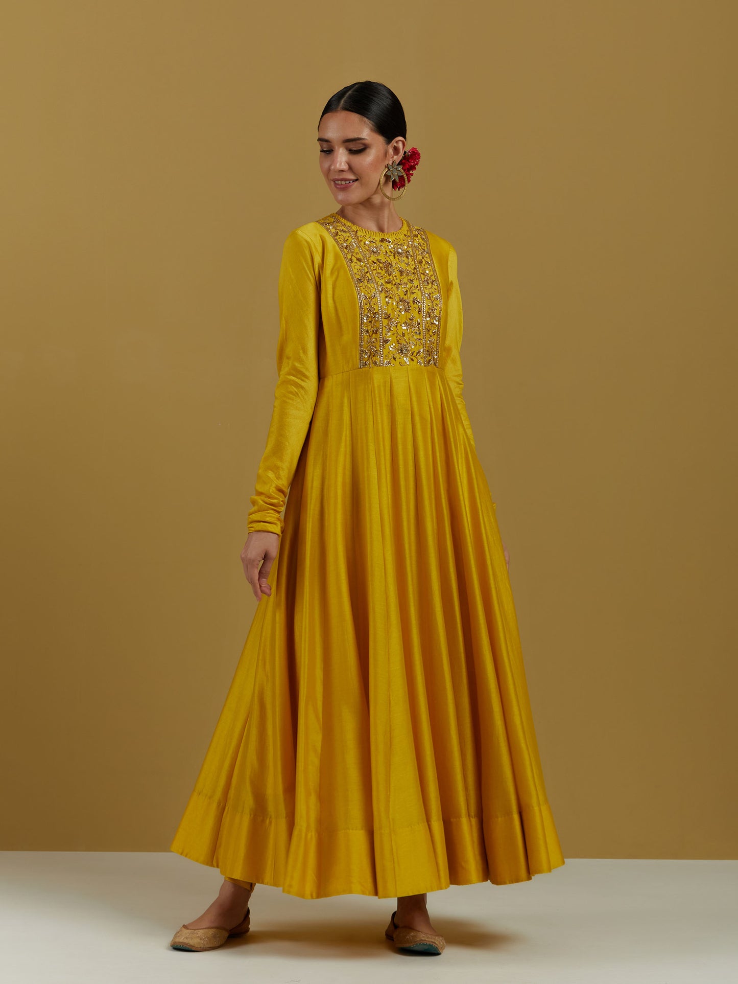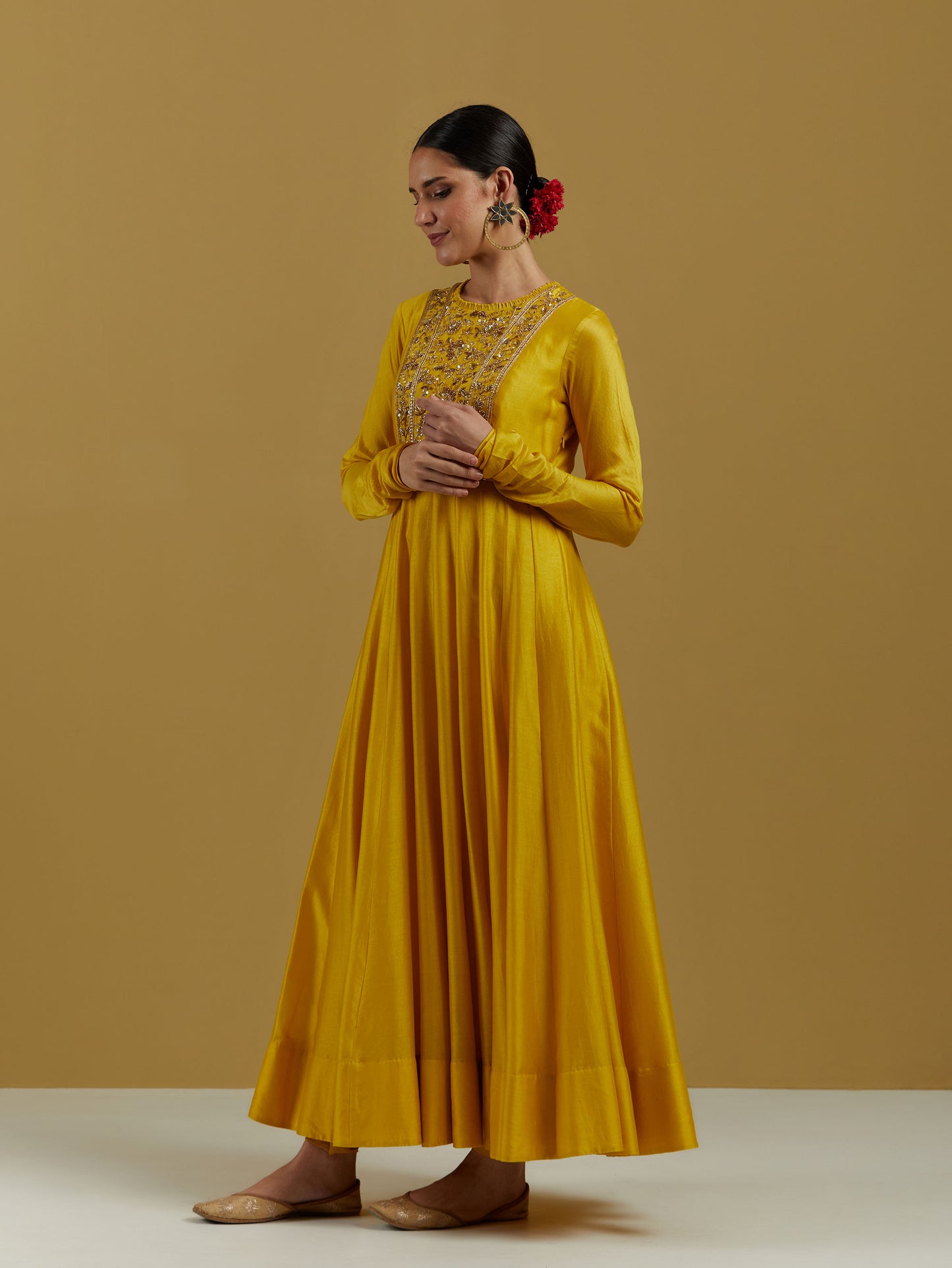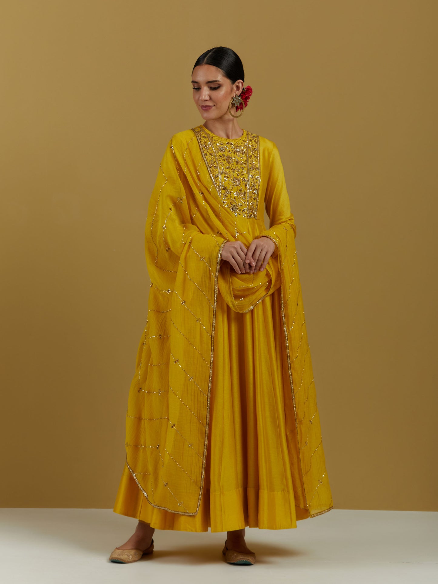 Yellow Chanderi Silk Hand Embroidered Anarkali Set