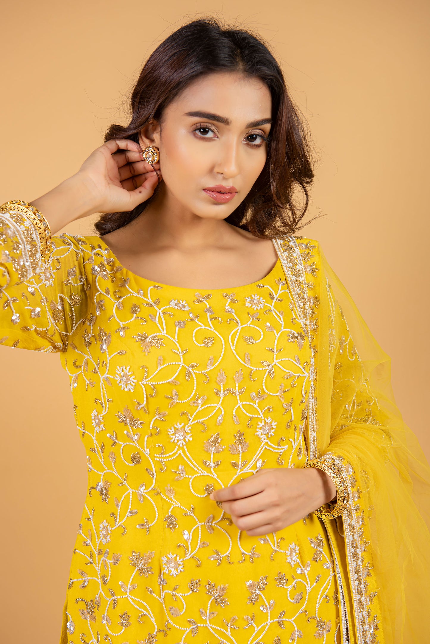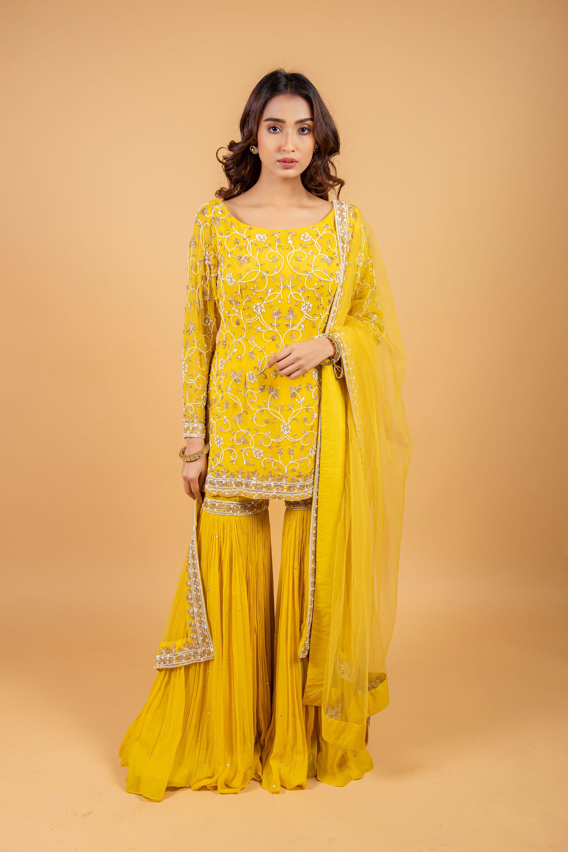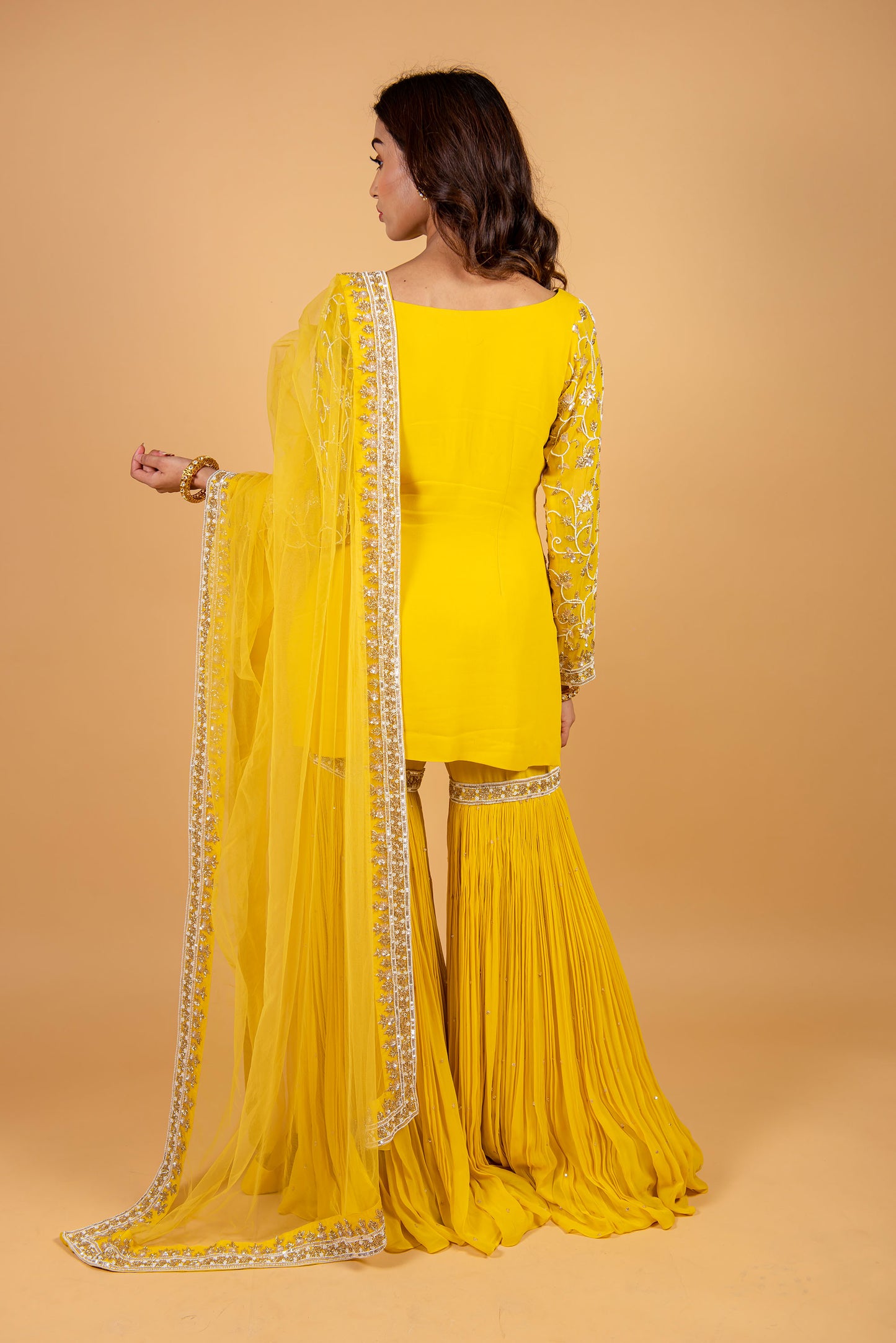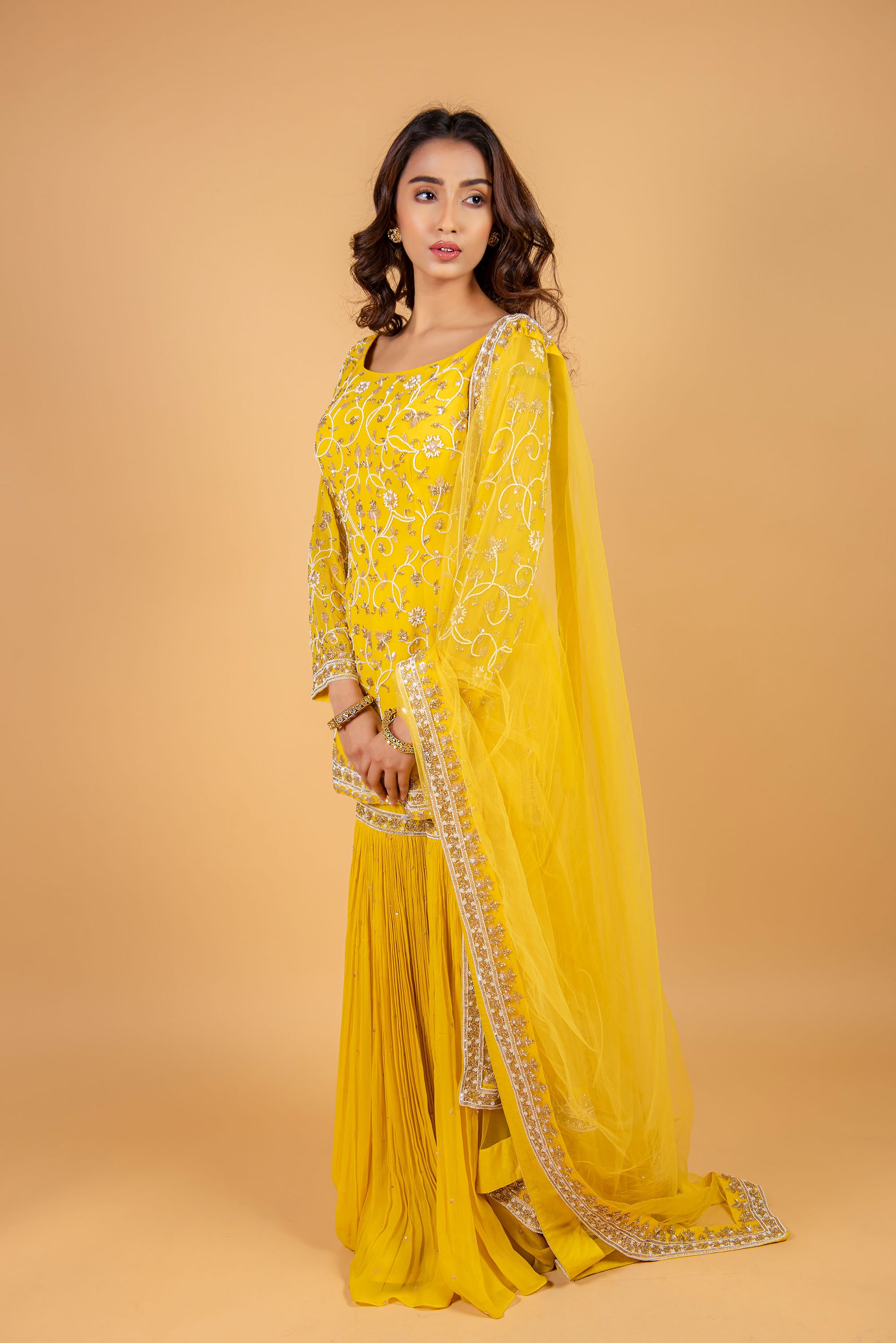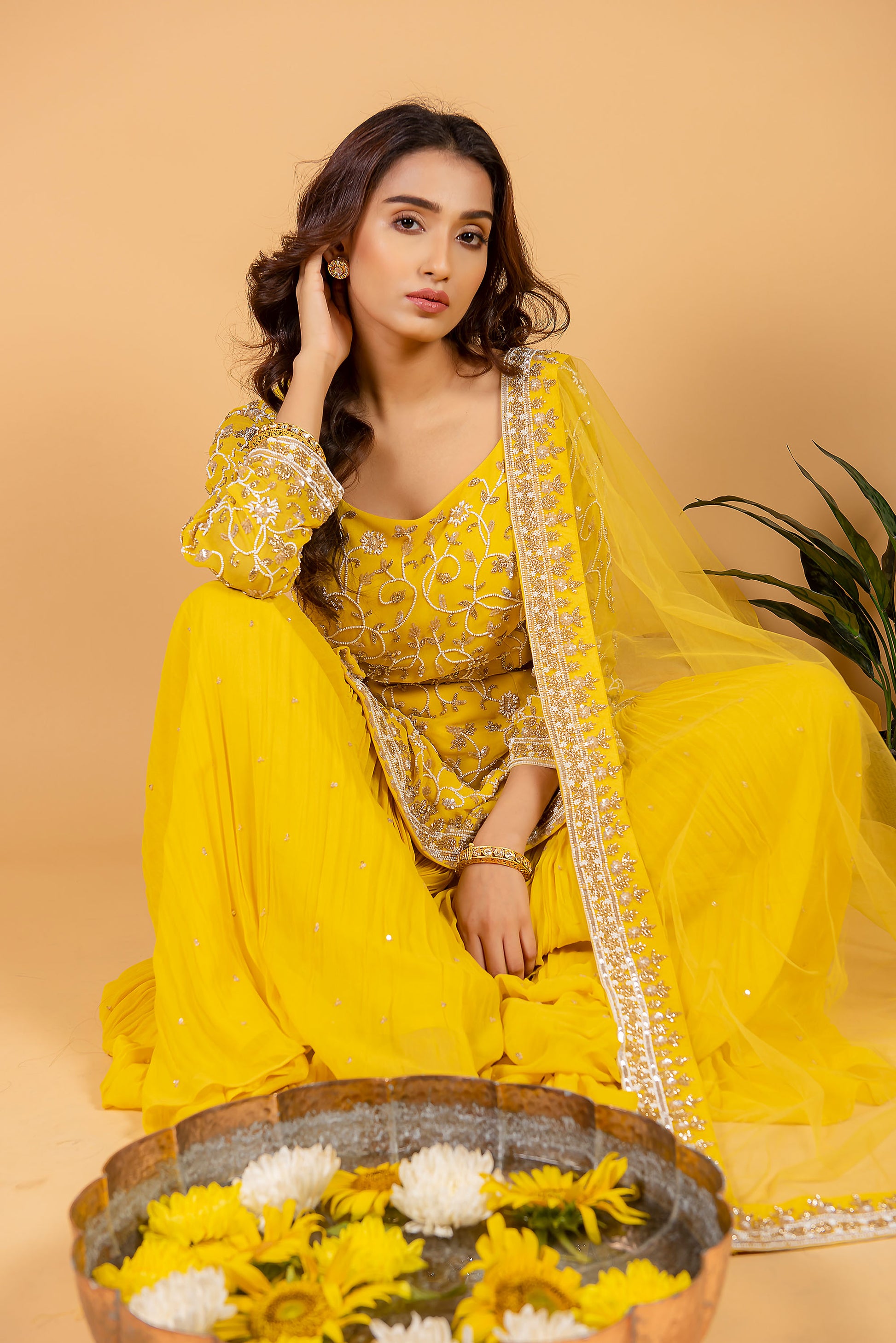 Yellow Color Net Embroidered Kurta Gharara Set for Haldi
