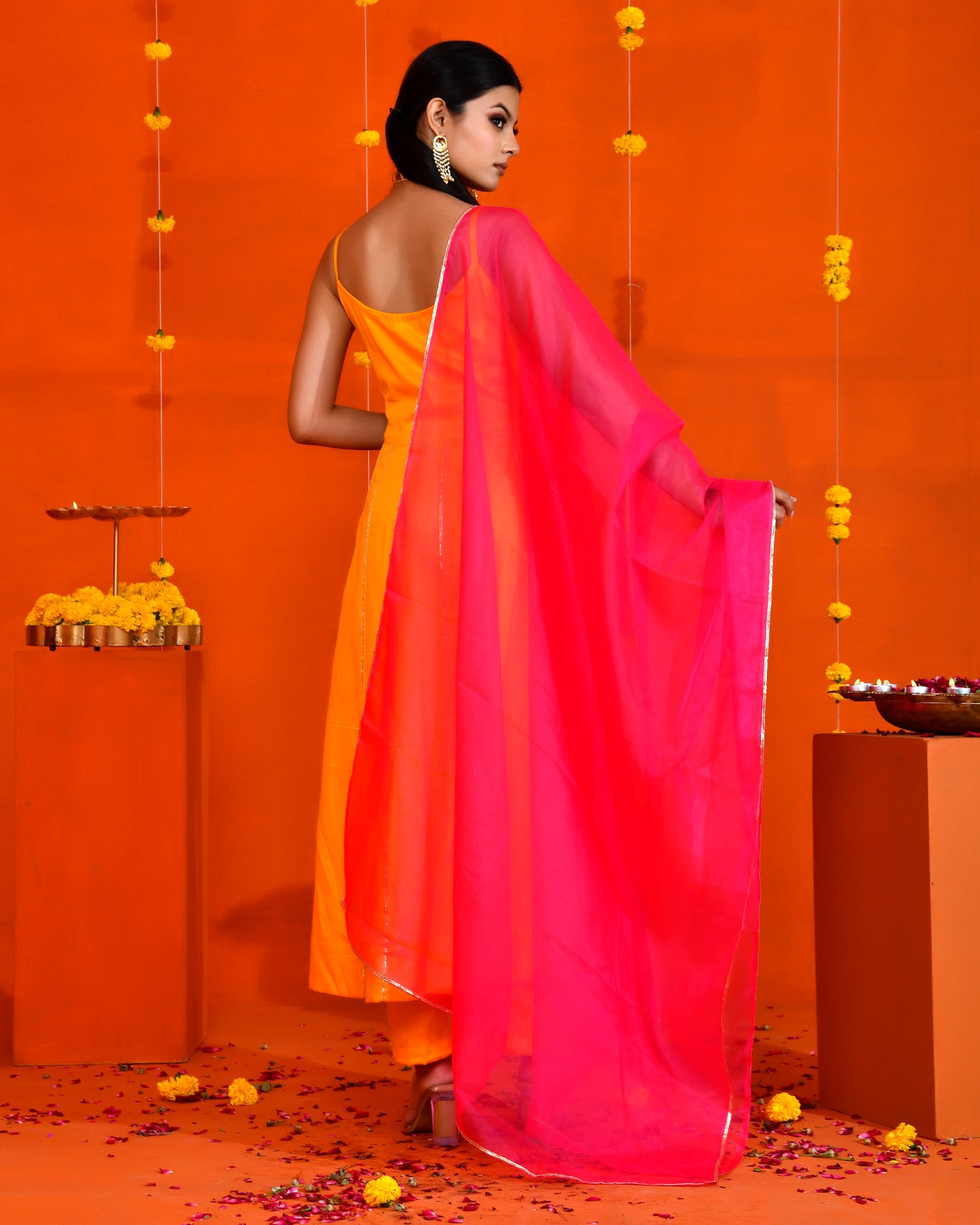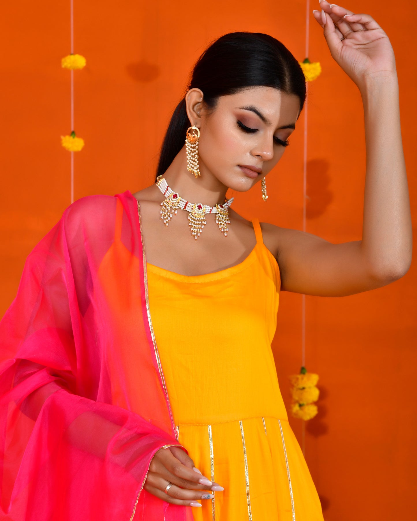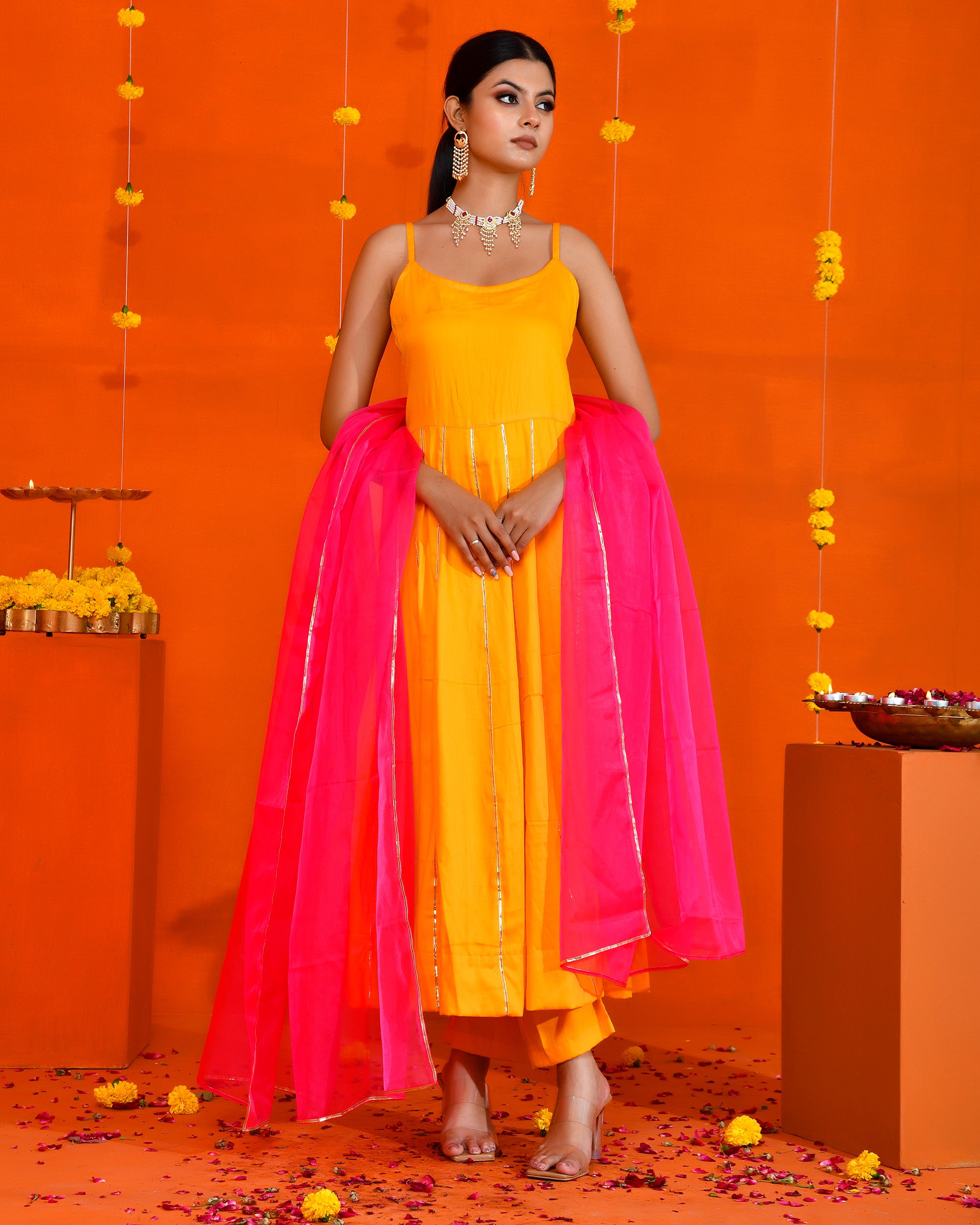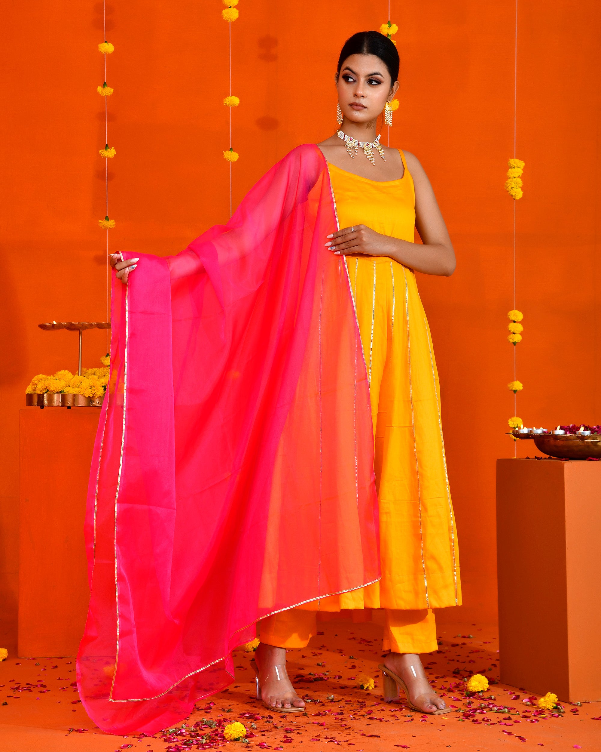 This Yellow, cotton silk suit set includes gota work anarkali, pant and magenta coloured organza dupatta.