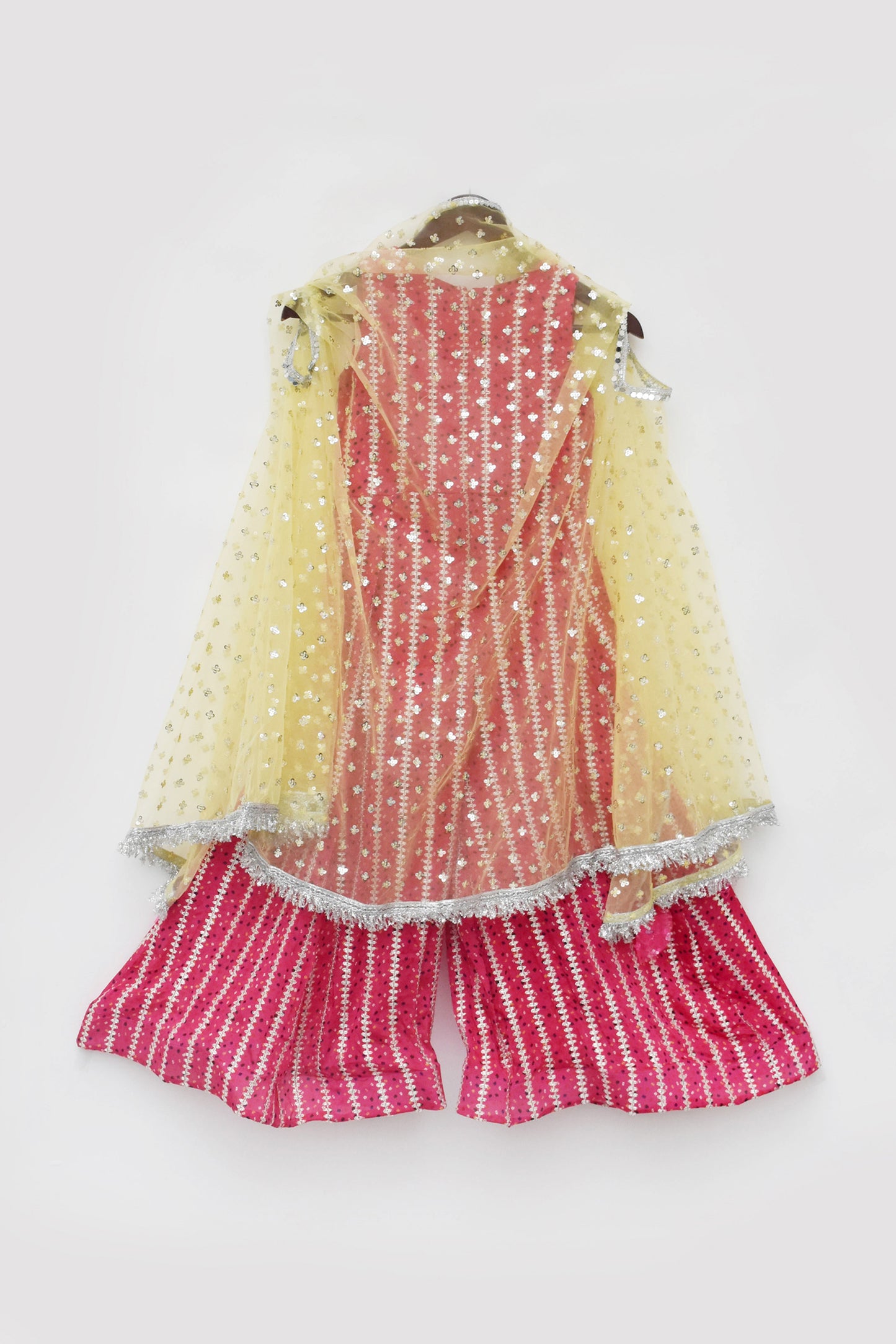 Introducing our Girls Yellow Embroidered Cape with Pink Jumpsuit ensemble, featuring a stylish one-piece jumpsuit with soft lining for utmost comfort. The bandhej print and sequence net cape add a touch of elegance, while the laces provide a beautiful finishing detail. This ensemble is perfect for any festivities, allowing your little one to stand out and shine with style.