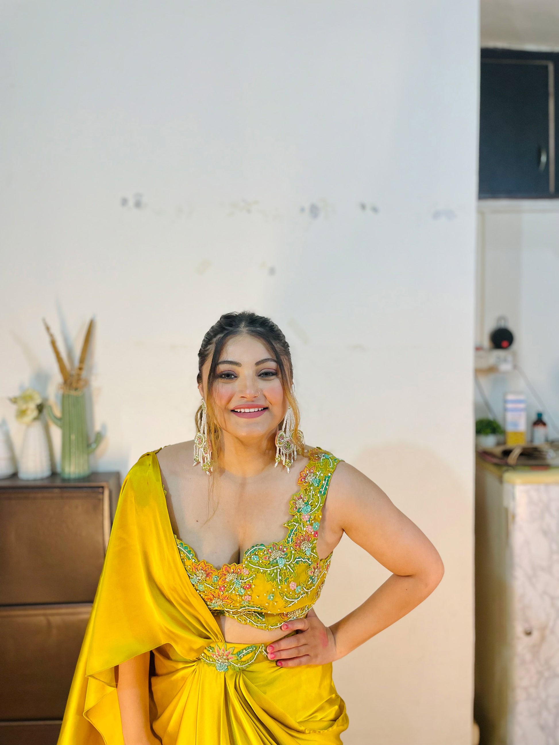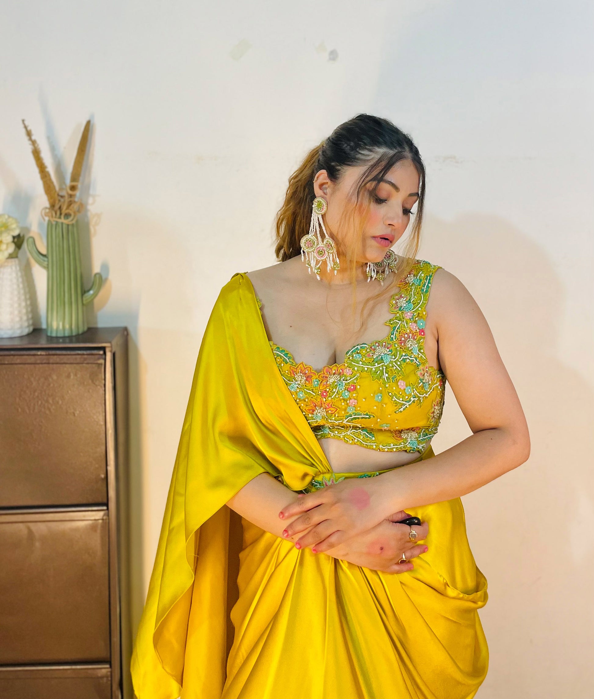 This set includes drape dhoti with embroidered blouse and . Dhoti is detailed with embroidery belt attached with drape palla .Blouse detailed with machine embroidery pink ,blue light dark shade Embellished with hand embroidery