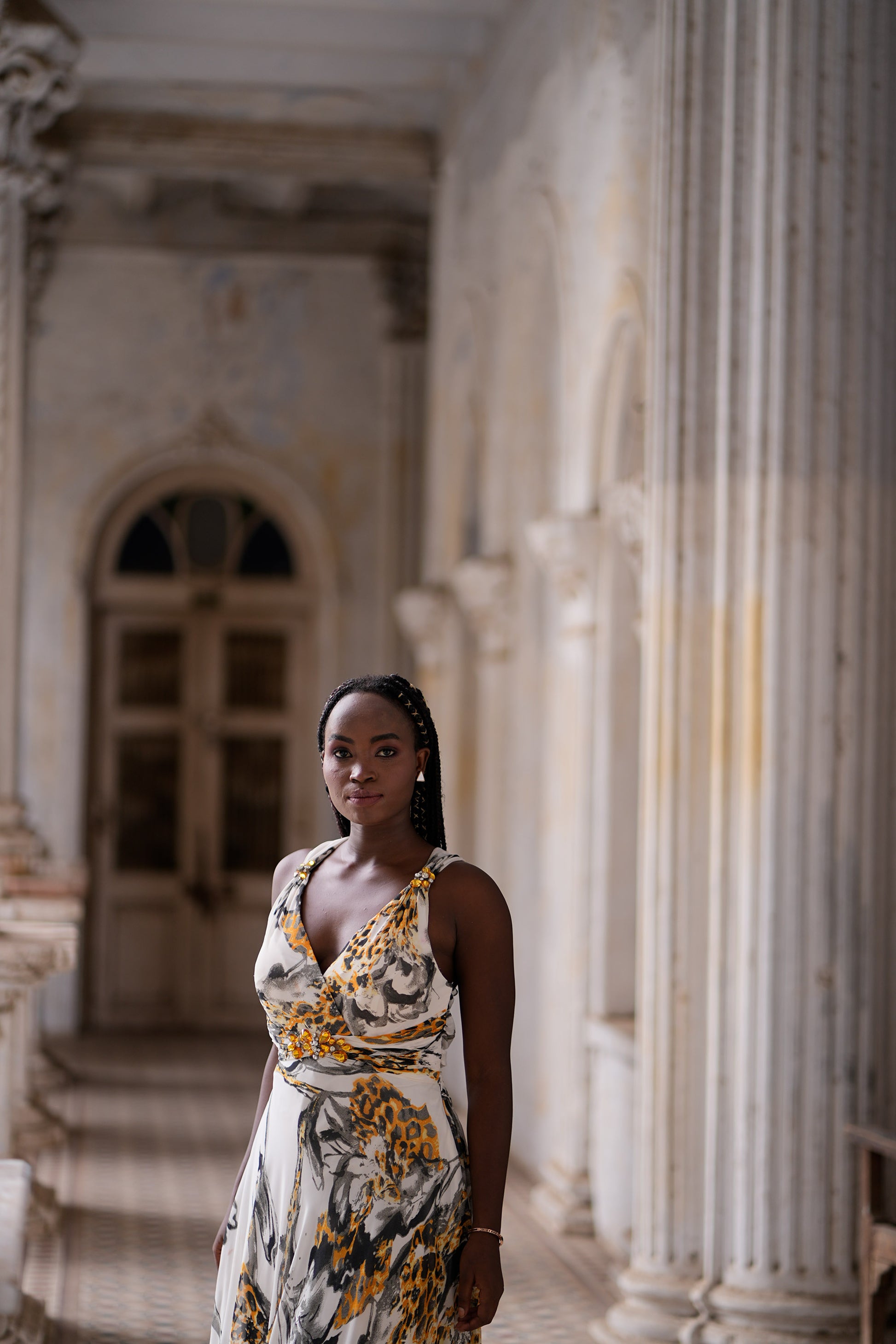 Yellow & White Satin summertime Animal Print Party Wear Gown