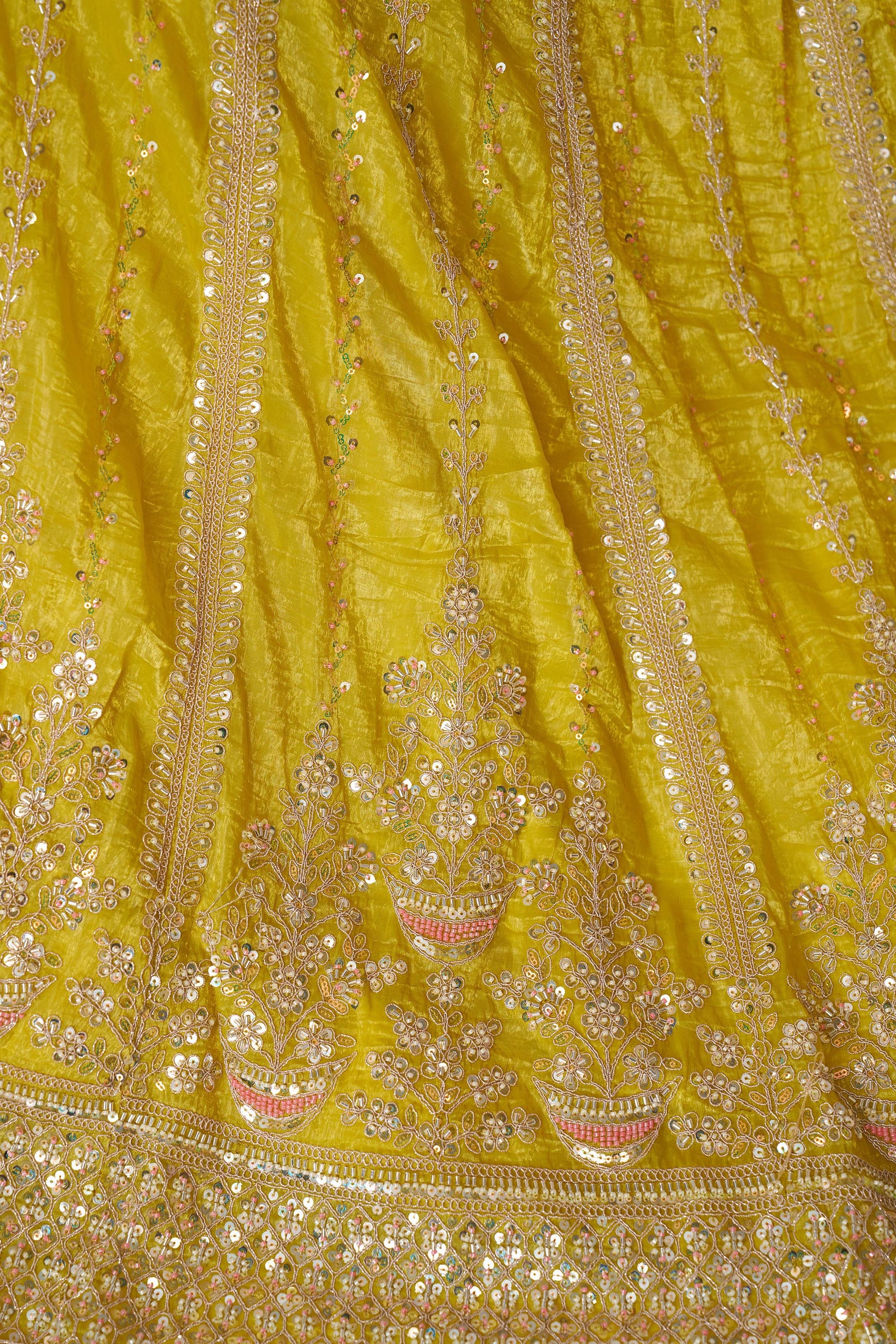 A vibrant yellow lehenga perfect for a Haldi ceremony, featuring a cheerful hue enhanced by the subtle sparkle of sequins and the intricate texture of cut dana work. This festive outfit is designed to radiate joy and celebrate the Haldi and wedding for bride and bridesmaid or bride.