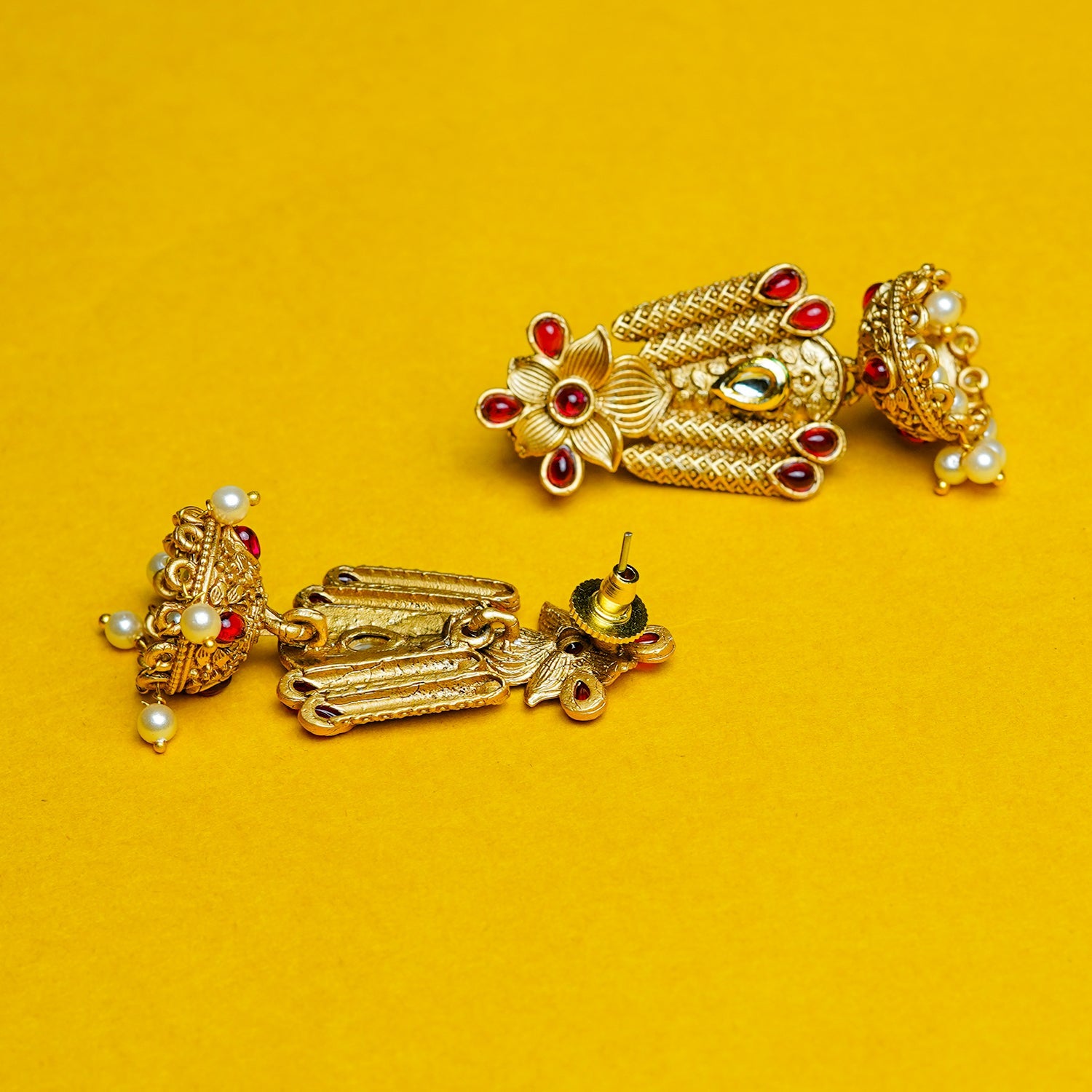 Zevar Club 18K Gold-Plated Red Kundan Stone Studded Floral Drop Earrings with Pearl Jhumka
