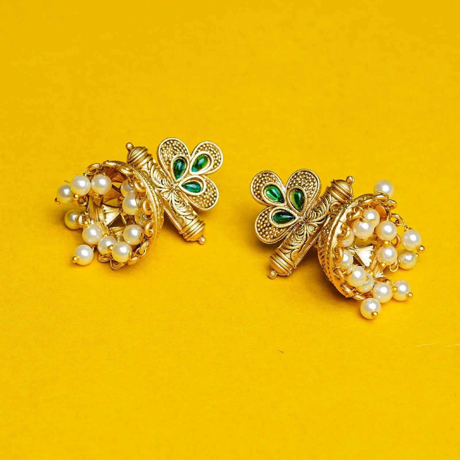 These 18K gold-plated jhumka earrings feature a floral green stone top, antique dome design with intricate texture, and white pearl drops—ideal for festive, temple, and traditional wedding styling.