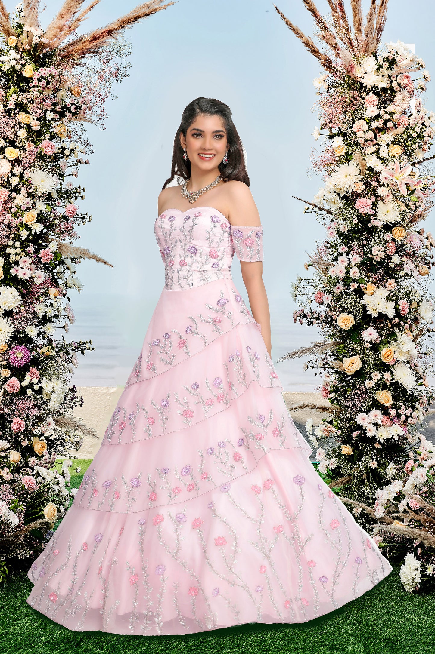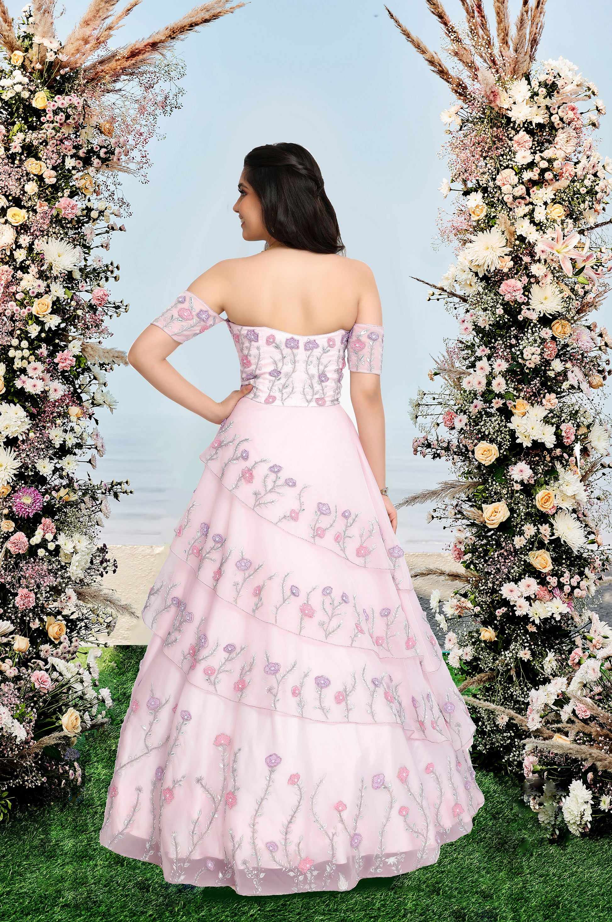 Pastel Pink off-shoulder hand embroidered corseted gown with 3d floral embellishments.